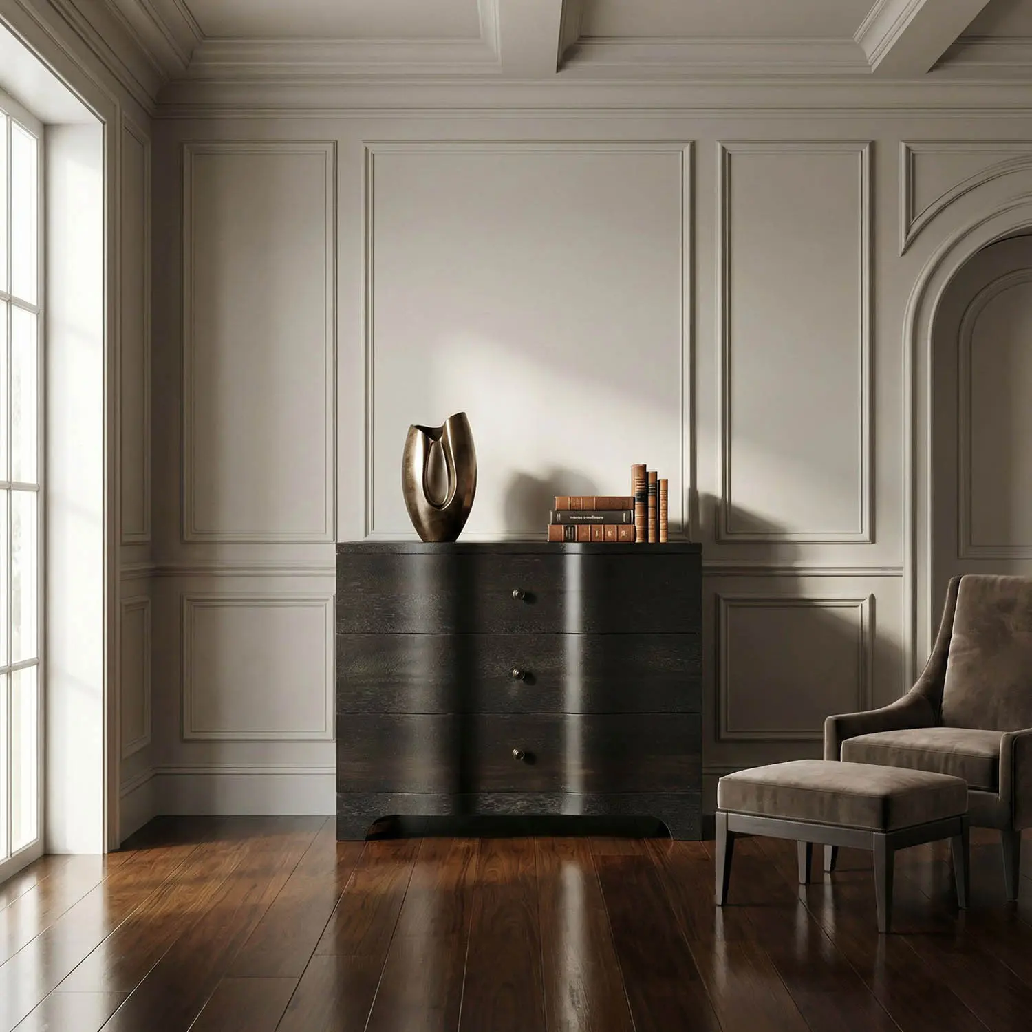 The Claudie Chest features drawer fronts with waved detail in Ebony Walnut finish, combining organic elements with a minimalist silhouette. Its sculptural simplicity complements modern or transitional interiors that seek a subtle tactile appeal.
