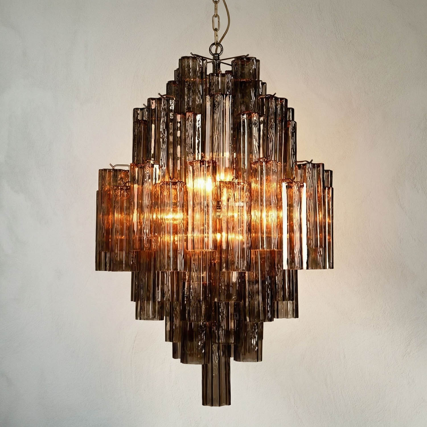This chandelier showcases a cascading, tiered design of textured glass arranged in staggered symmetry. Its smoked glass and chrome framework evokes a refined Mid-Century Modern elegance with dramatic sculptural presence.