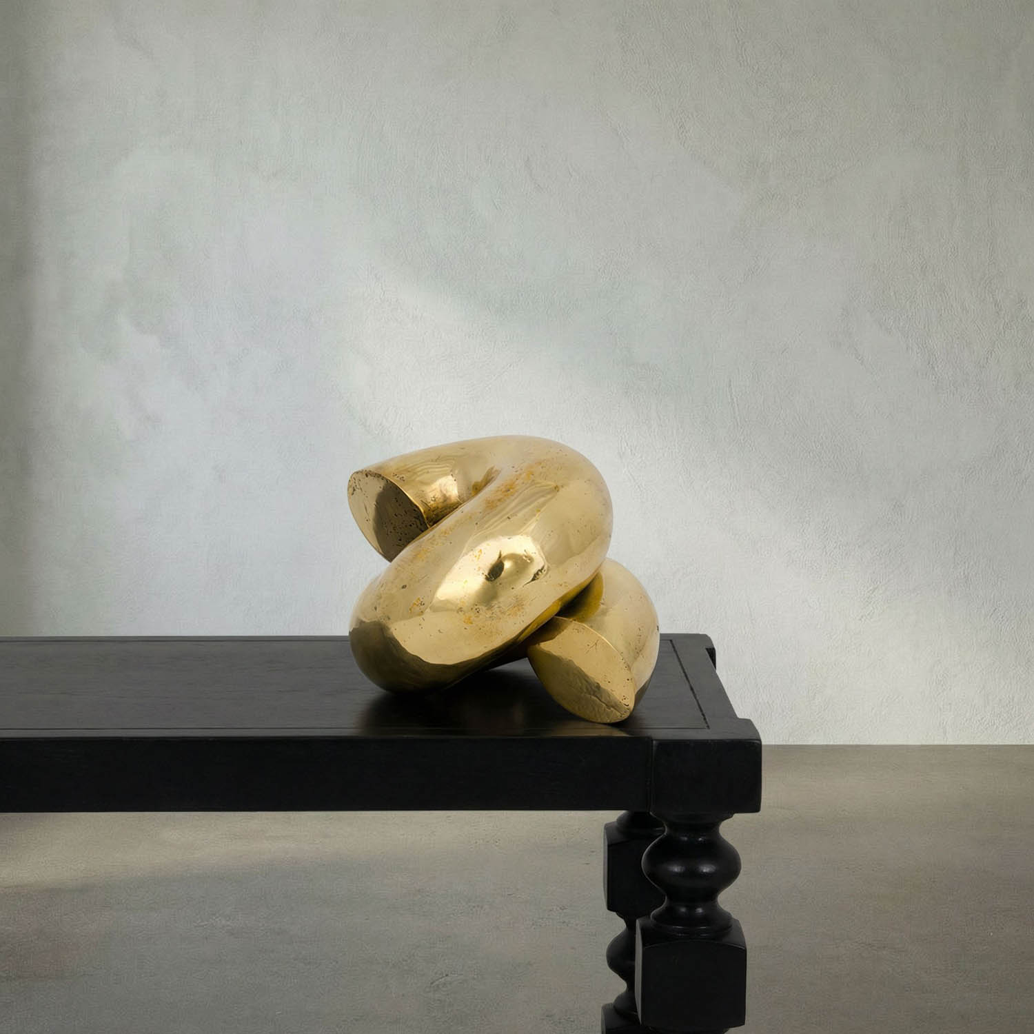 This brass sculpture is an abstract, intertwined form with smooth, flowing curves and a highly polished surface. The shape, a continuous knot or an organic loop, evokes a sense of movement and fluidity.