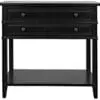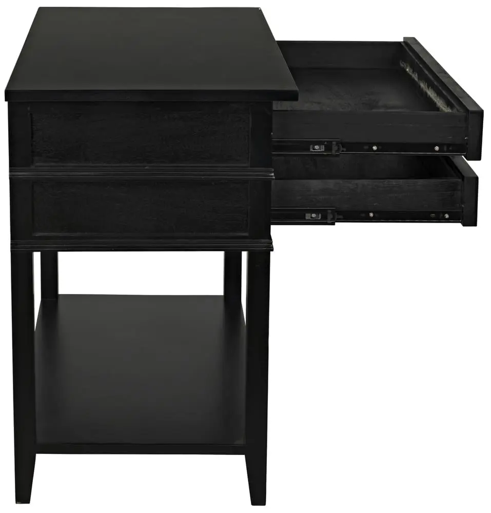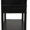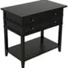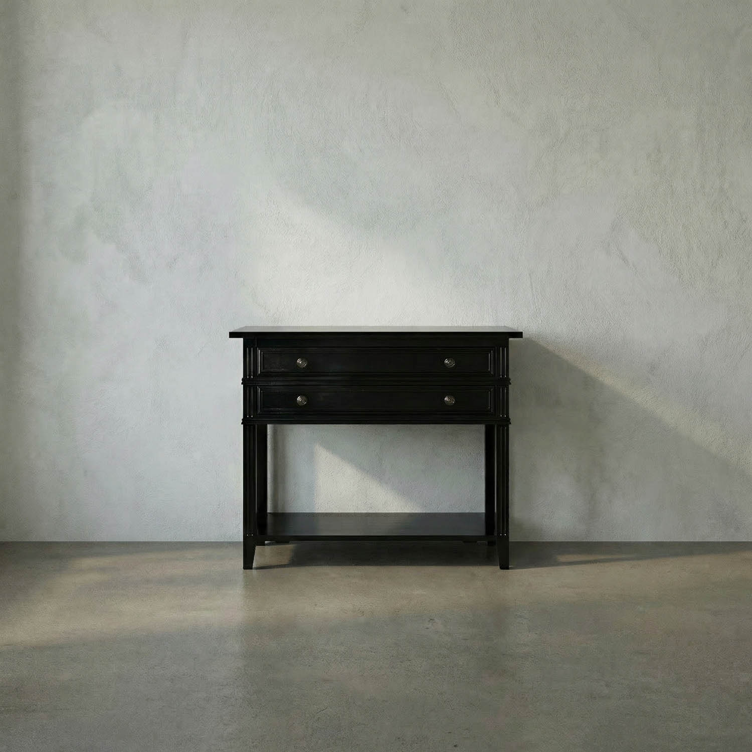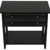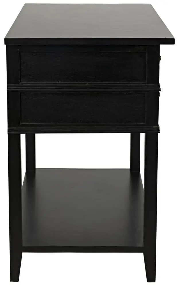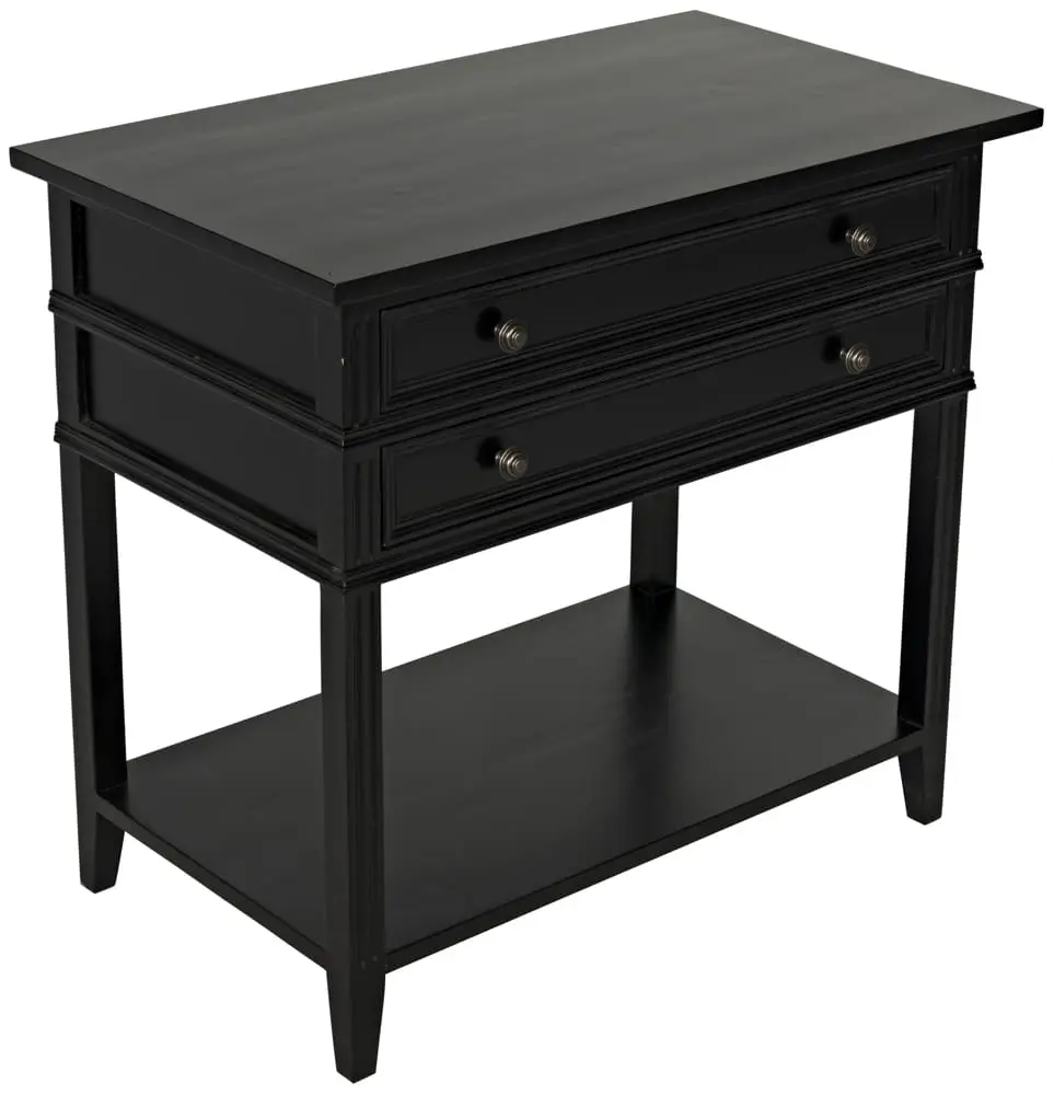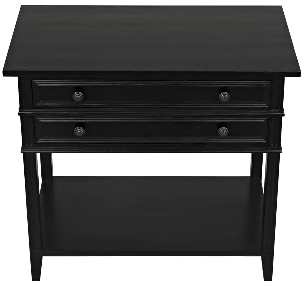A timeless birch side table with Distressed Black finish, featuring recessed_panel drawers, fluted legs, antique hardware, and a lower shelf. It’s heirloom-inspired design blends traditional craftsmanship with practical elegance.