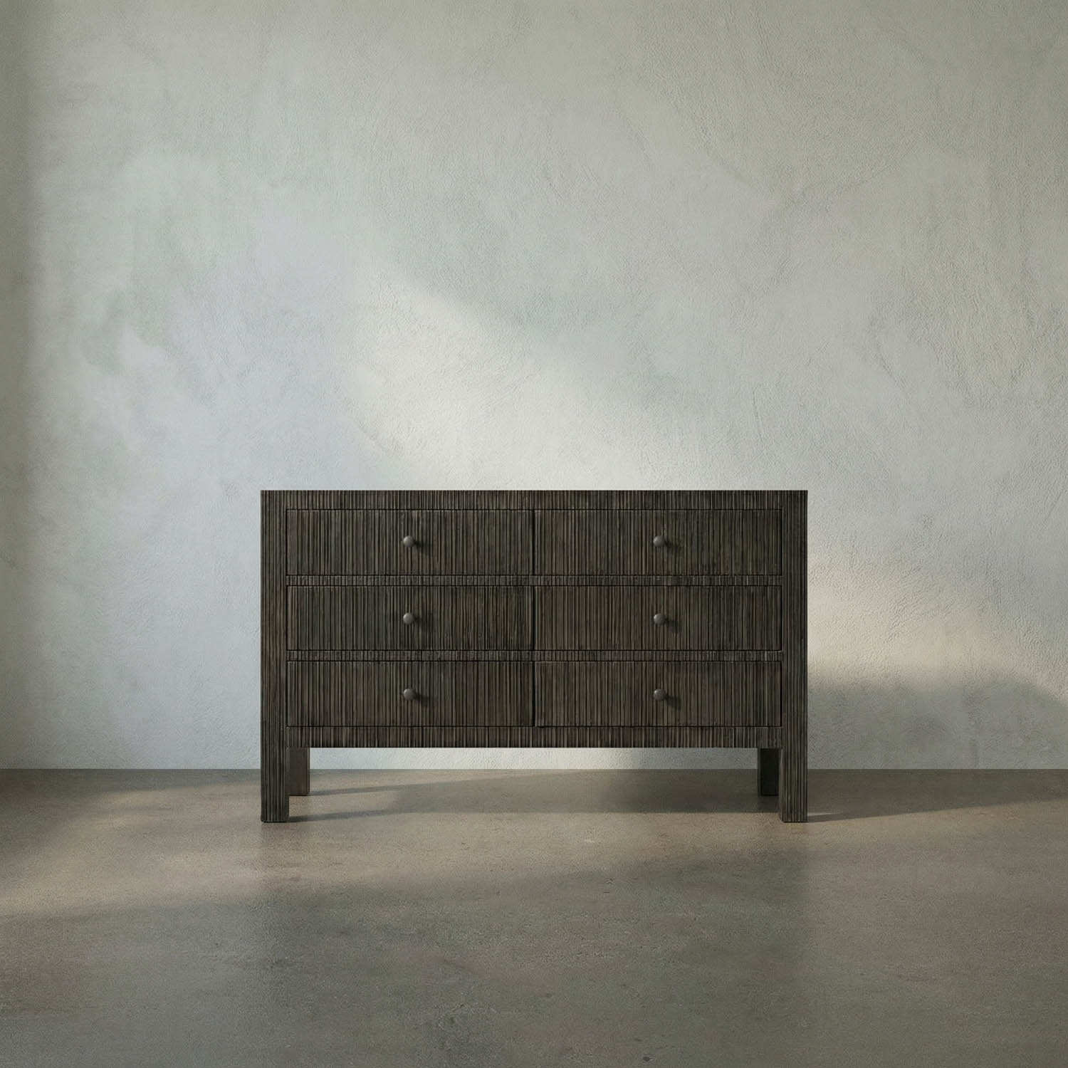 The Conrad Dresser, featuring six drawers, showcases hand-carved vertical ribbing in our Pale finish. Antique brass hardware adds a classic touch to its refined and textured silhouette, making it ideal for transitional or coastal-inspired spaces.