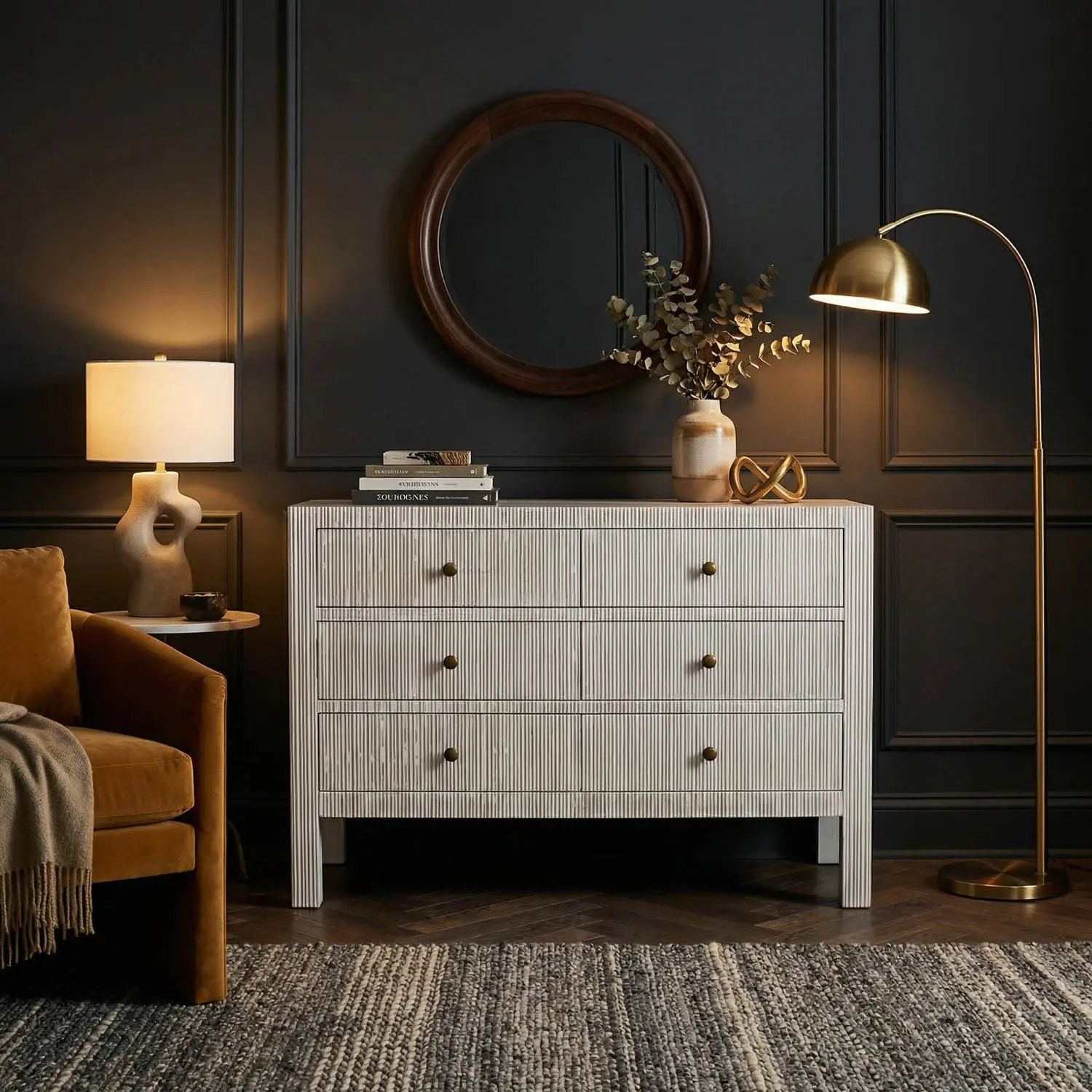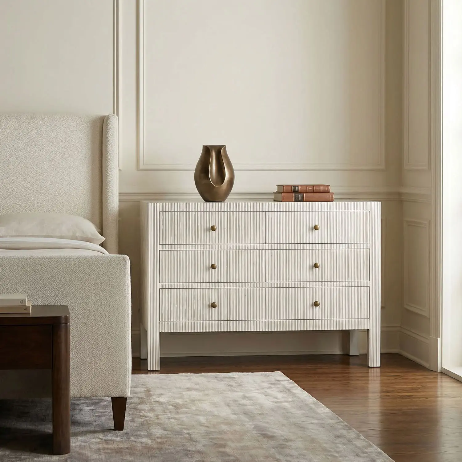 The Conrad Dresser, featuring six drawers, showcases hand-carved vertical ribbing in our White-Wash finish. Antique brass hardware adds a classic touch to its refined and textured silhouette, making it ideal for transitional or coastal-inspired spaces.
