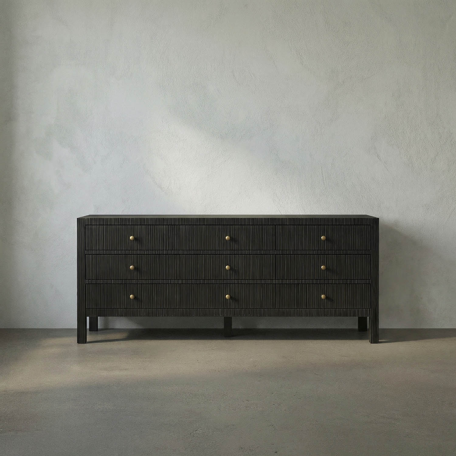The Conrad Dresser, featuring nine drawers, showcases hand-carved vertical ribbing in our Pale finish. Antique brass hardware adds a classic touch to its refined and textured silhouette, making it ideal for transitional or coastal-inspired spaces.