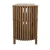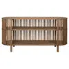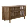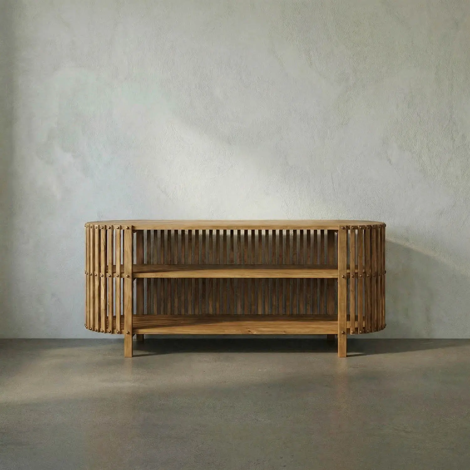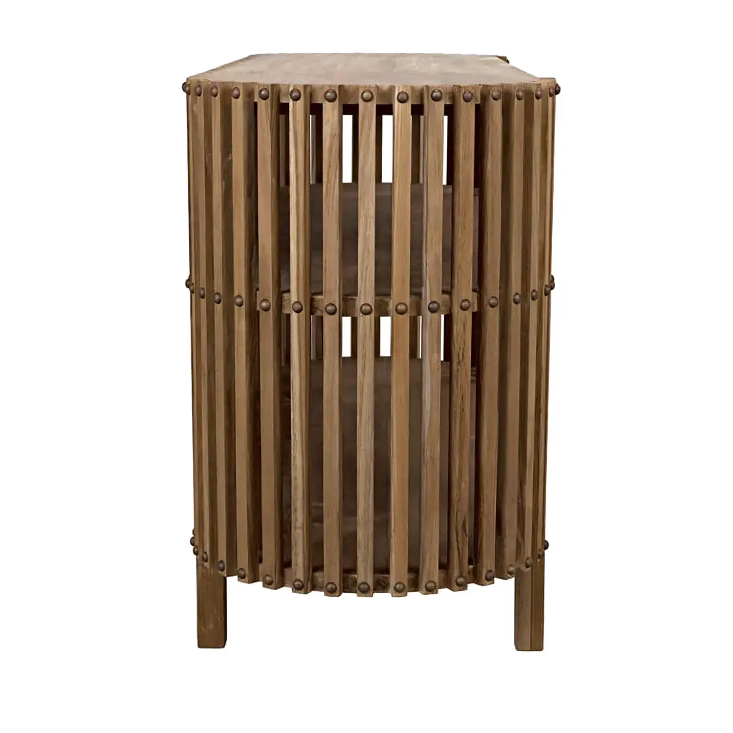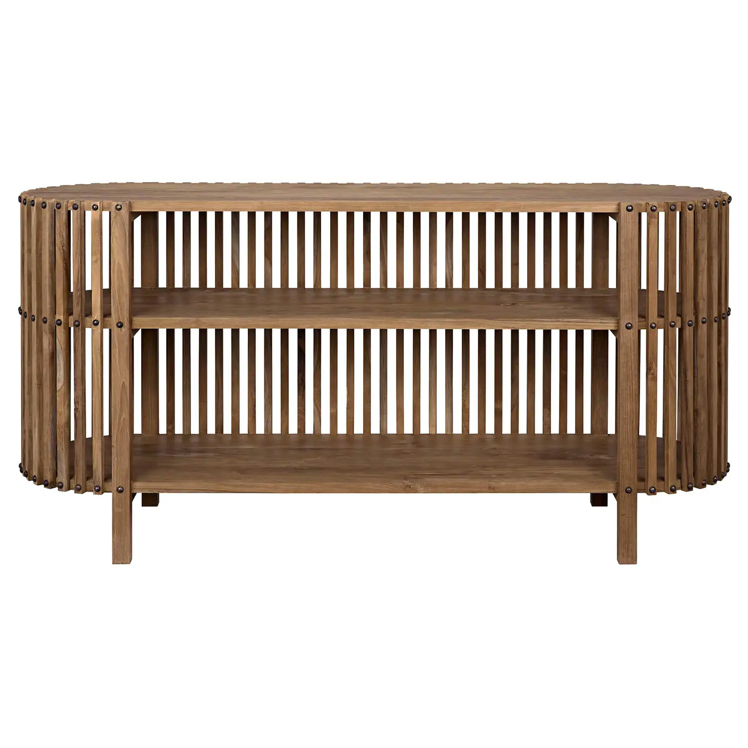 The curved, slated frame of the Consuela Console features a light finish that highlights the teak’s natural beauty. The oversized antique brass nailhead detail enhances the curved top, sides, and shelf.