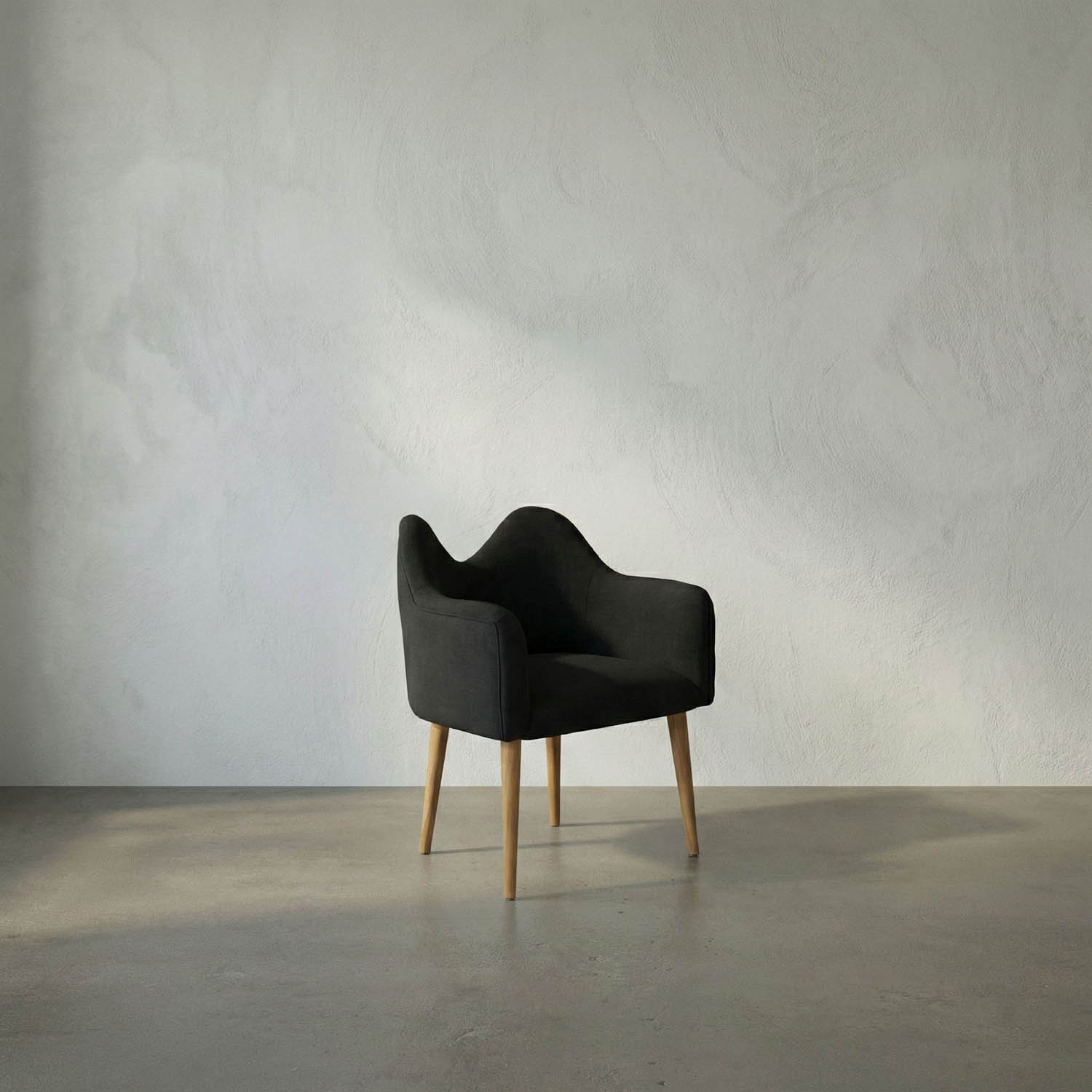 The Cornelia Chair boasts a curvaceous back that hints at the golden age of Hollywood glamour. Black cotton upholstery and lithe, tapered Teak legs complete the versatile look.