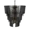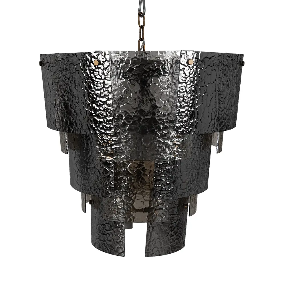 This chandelier features a tiered silhouette made of overlapping textured smoked-glass panels. The cascading design creates sculptural depth and dynamically diffuses light. Its dark, reflective glass panels provide a sophisticated, contemporary aesthetic, making it ideal for bold interiors.