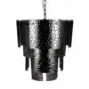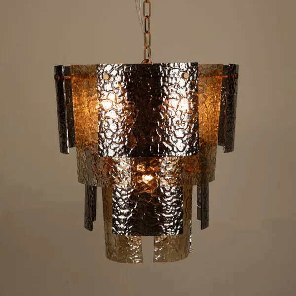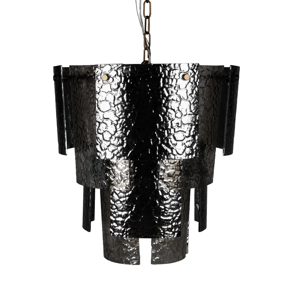 This chandelier features a tiered silhouette made of overlapping textured smoked-glass panels. The cascading design creates sculptural depth and dynamically diffuses light. Its dark, reflective glass panels provide a sophisticated, contemporary aesthetic, making it ideal for bold interiors.