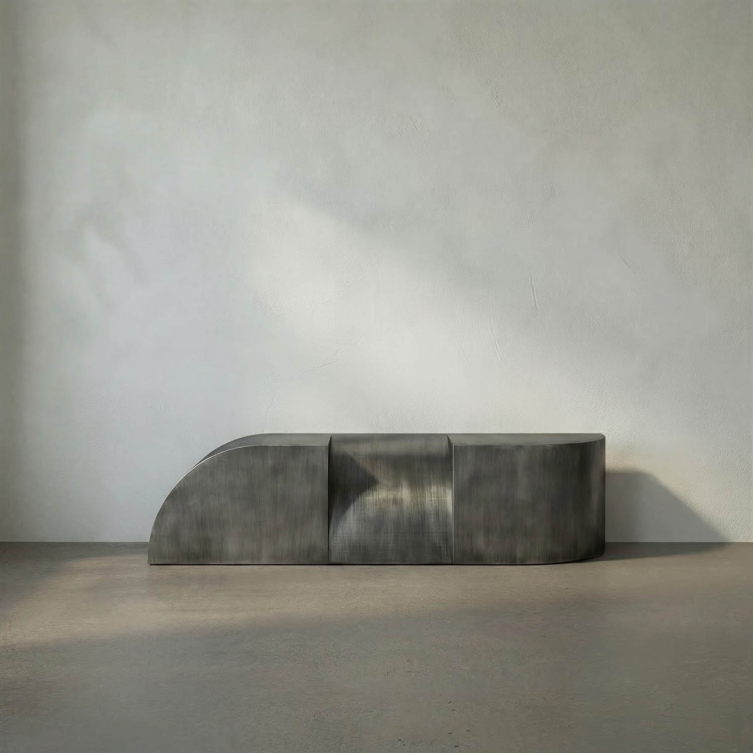 The sculptural Crafter Bench is made from brushed metal and features a bold, geometric form. Its design merges curves and clean lines, creating a striking, almost architectural presence.