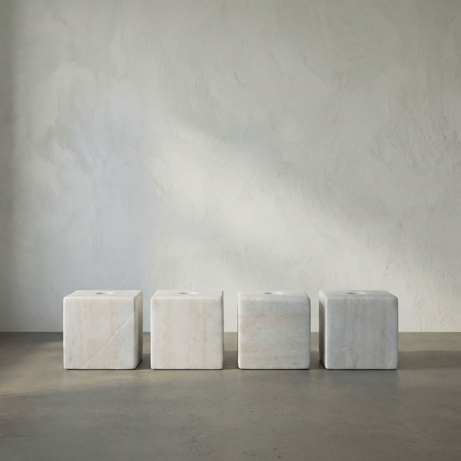 The Cube Candle Holder set includes four hand-carved marble cubes with flat tops, perfect for taper candles. Crafted from white Bianco Crown marble, each piece showcases subtle natural veining, blending minimalist geometry with the organic texture of the stone.