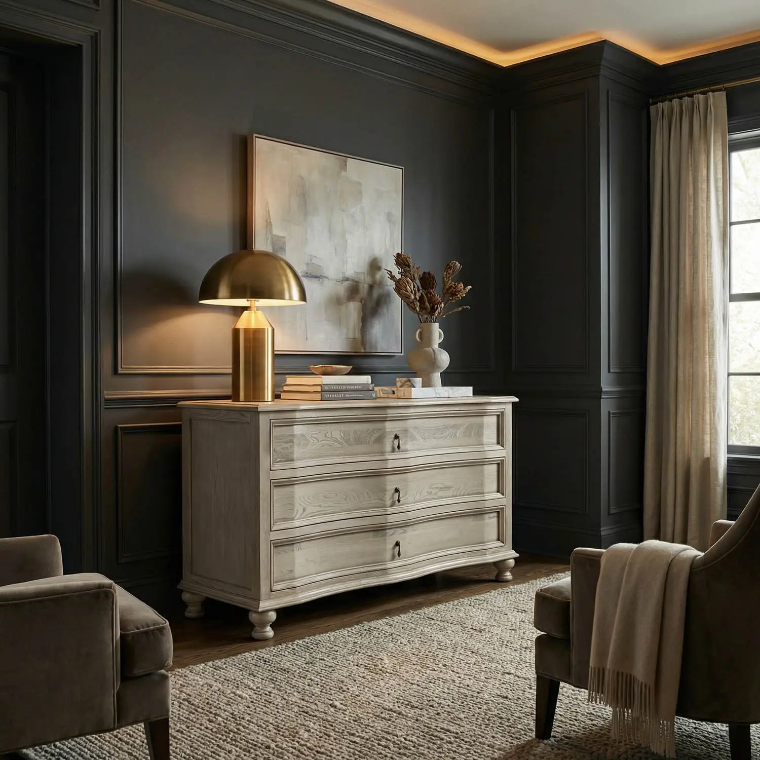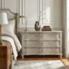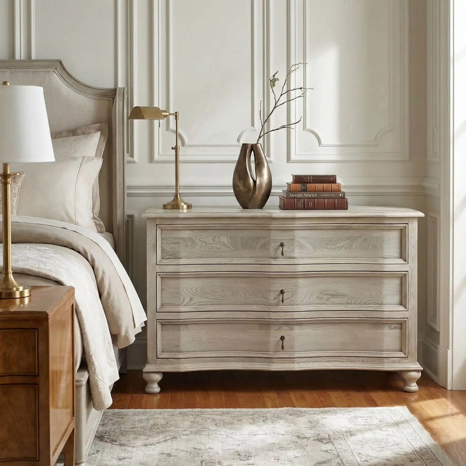 Crafted from elm with a Vintage Grey finish, the Curved-Front Chest features soft convex lines, turned ball feet, and refined solid brass hardware. This piece is a quietly architectural blend of classic form and modern restraint.