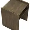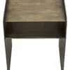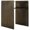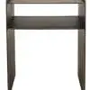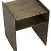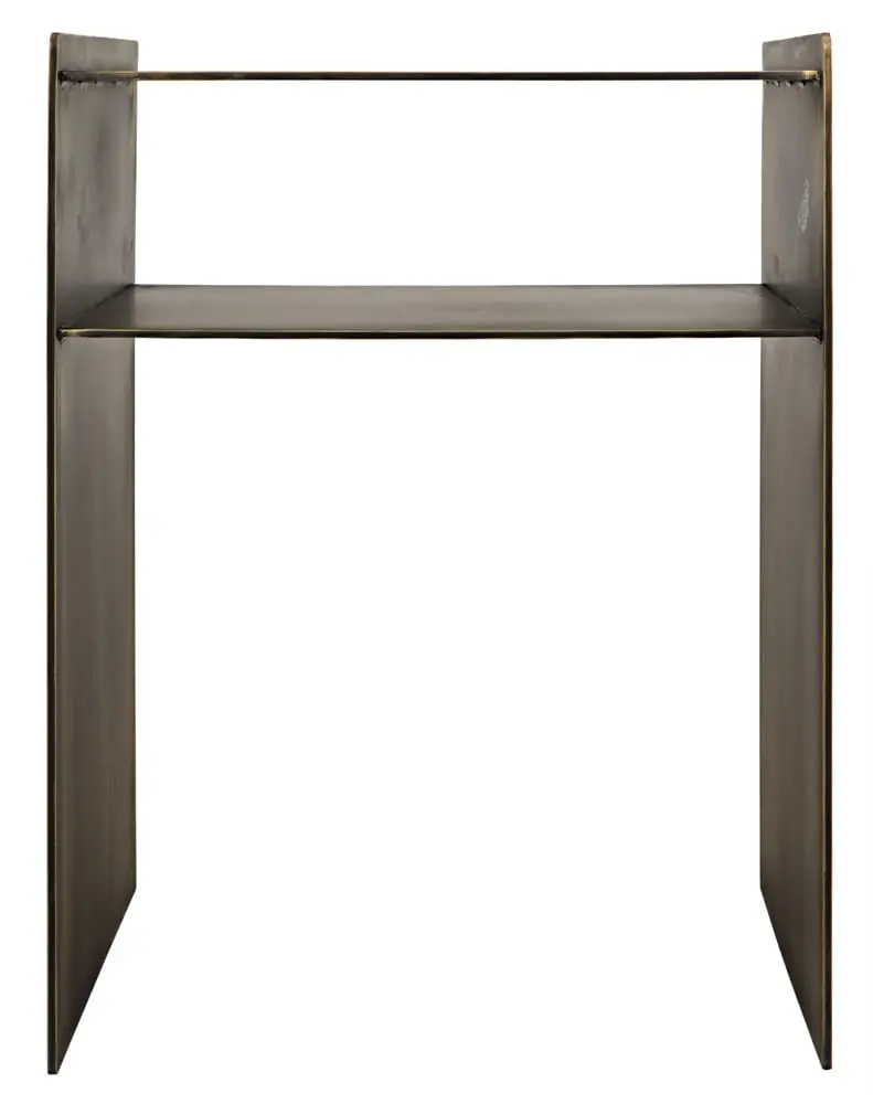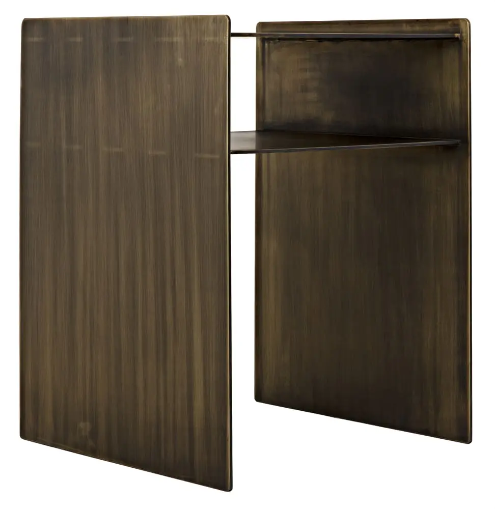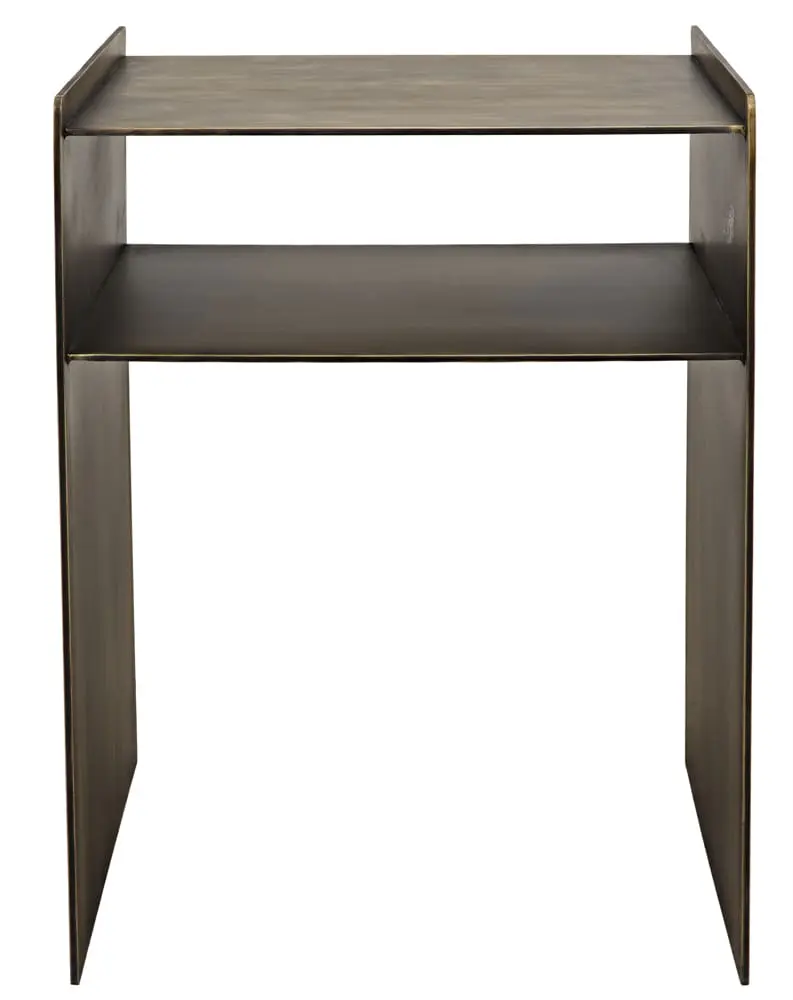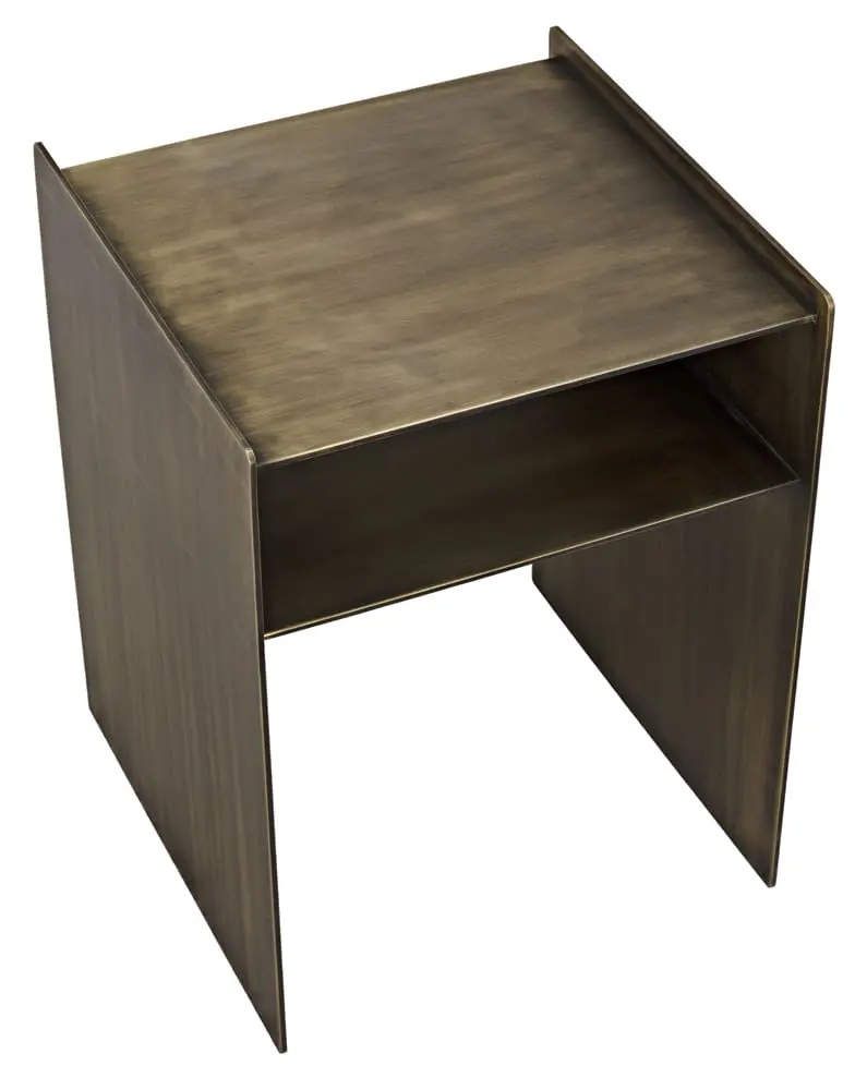 This compact one-shelf table combines crisp modern lines with a warm Aged Brass, offering durability and sculptural simplicity that complements both contemporary and transitional spaces.