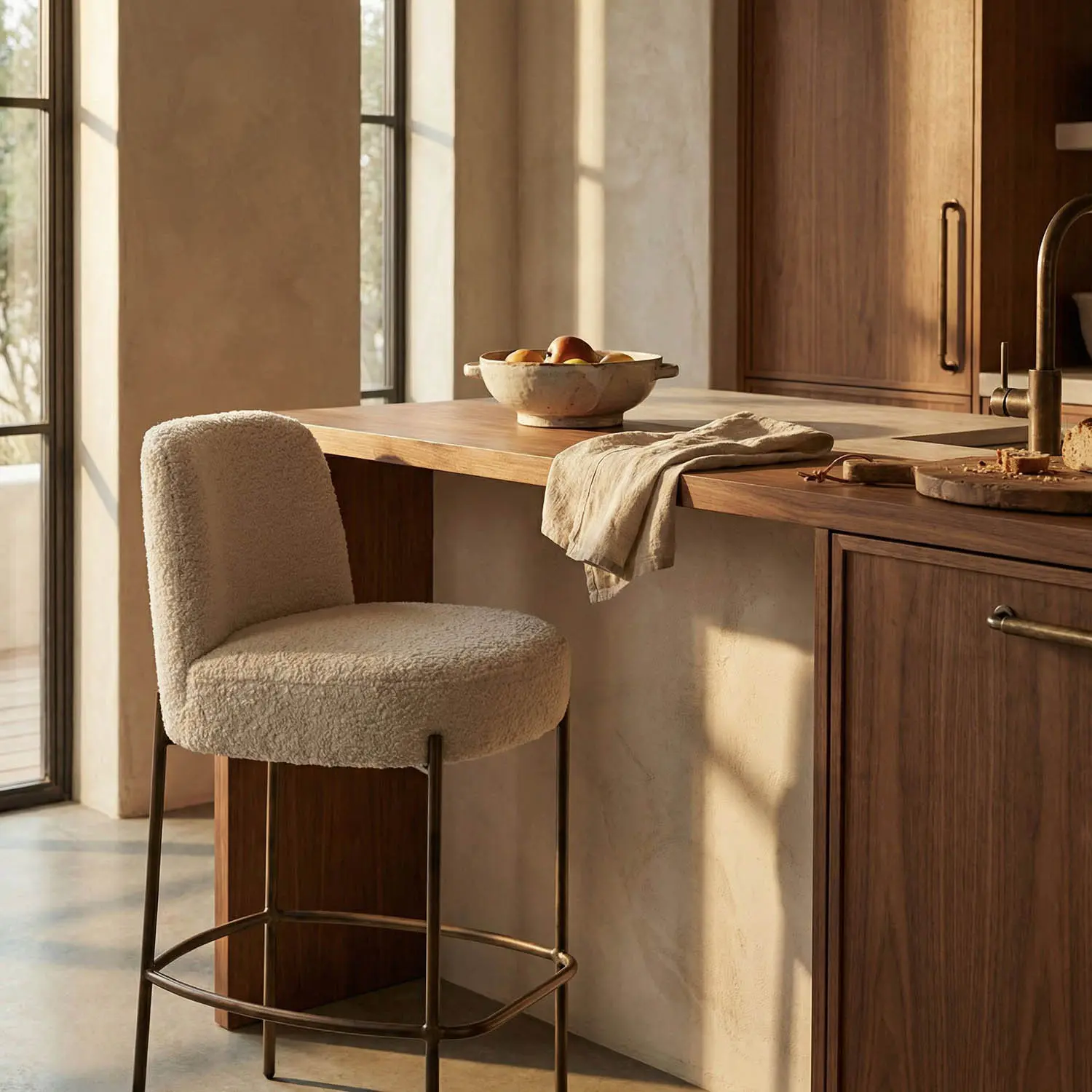 This counter stool combines an iron frame with soft boucle upholstery, resulting in a refined Modern-Industrial aesthetic. Its sleek, compact silhouette and tactile contrast harmonize practicality with elevated design.