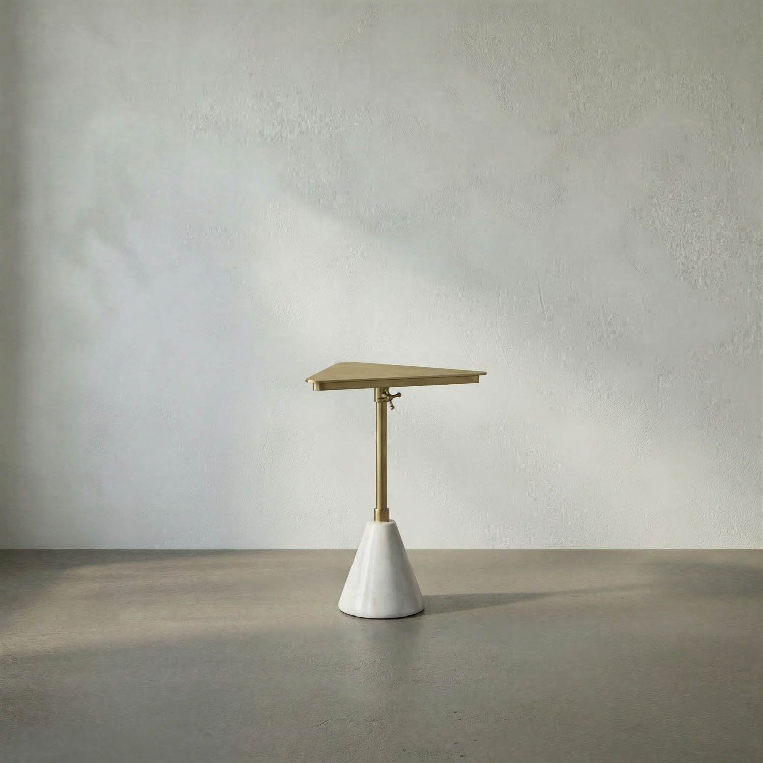 The triangular Aged Brass top and stem rest on a conical white marble base, resulting in a sculptural side table that combines geometric minimalism with luxurious materials, ideal for modern and refined interiors.