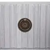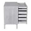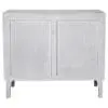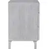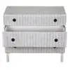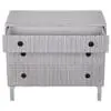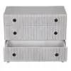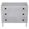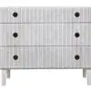 The Daryl Dresser features ribbed details on three mahogany drawer fronts, finished in White Wash, with circular brass pulls. Its compact design and tactile texture add subtle dimension to modern, rustic, or transitional interiors.