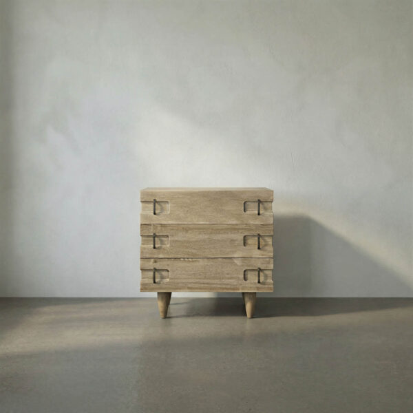 This three-drawer side table in Washed Walnut features a walnut frame with clean lines and tapered legs. Its rustic yet refined design adds substantial presence to both modern and transitional interiors.