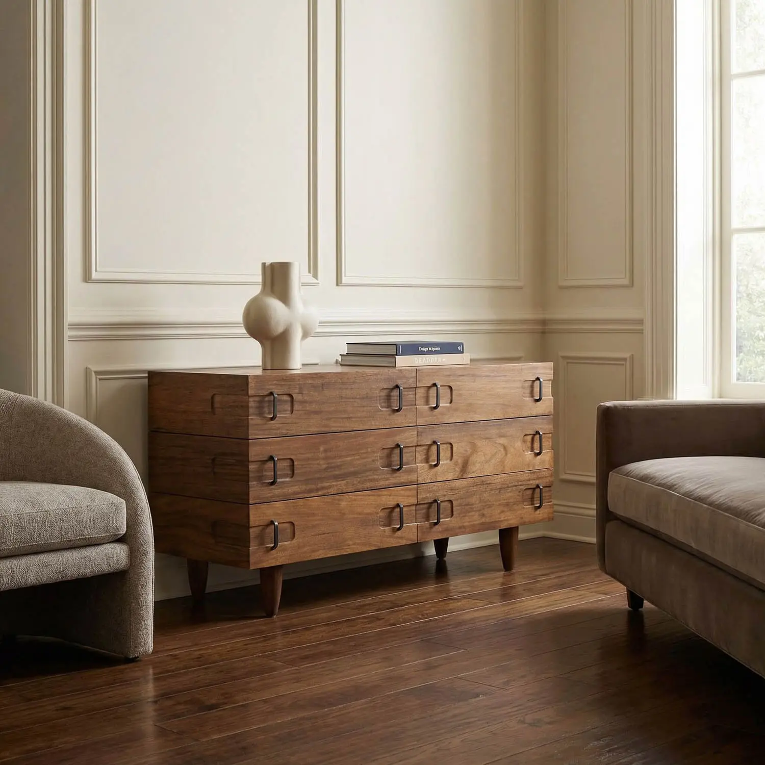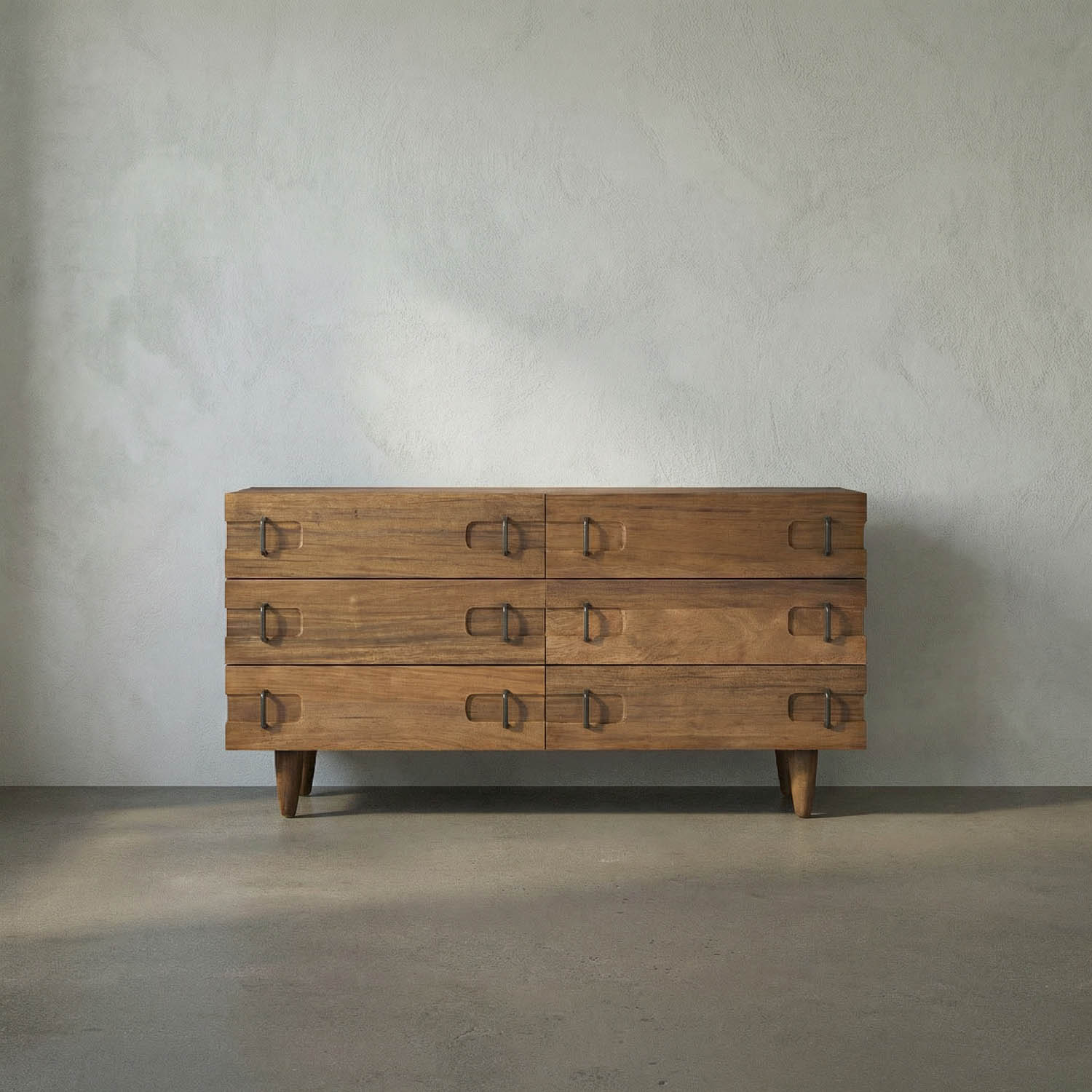 This walnut cabinet features a warm Dark Walnut finish and mid-century modern style with six drawers, recessed rectangular accents, black iron pull handles, and tapered legs for a light, classic appearance.