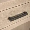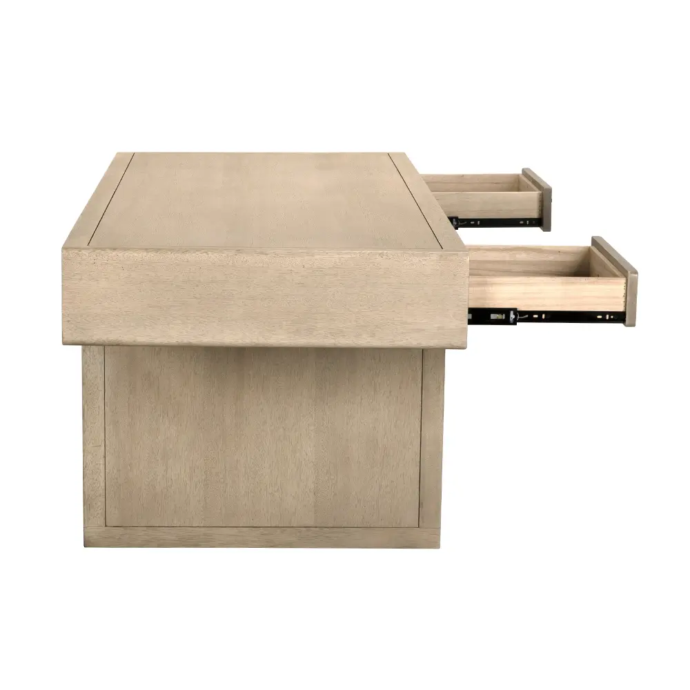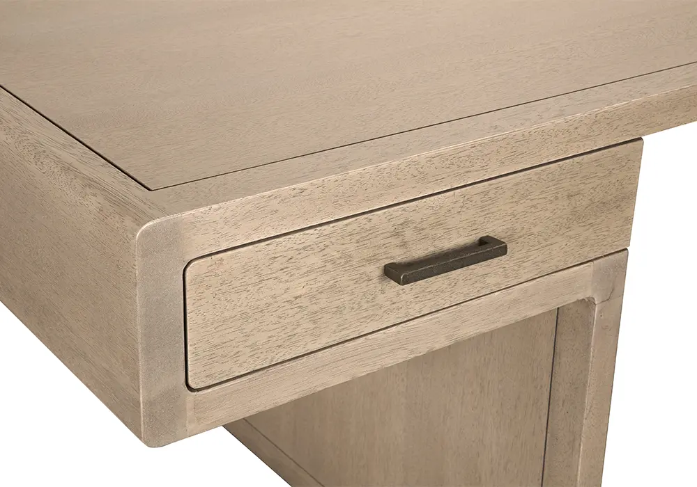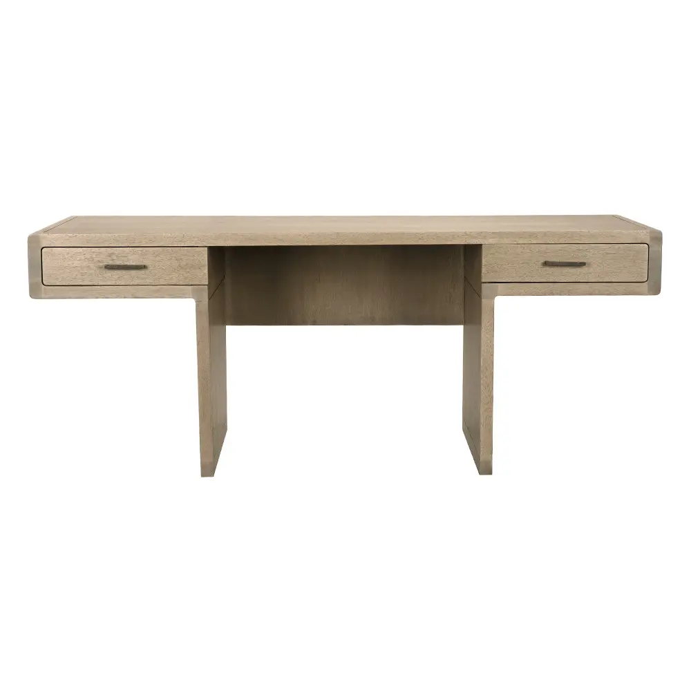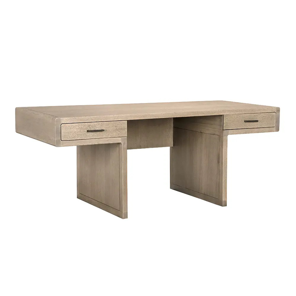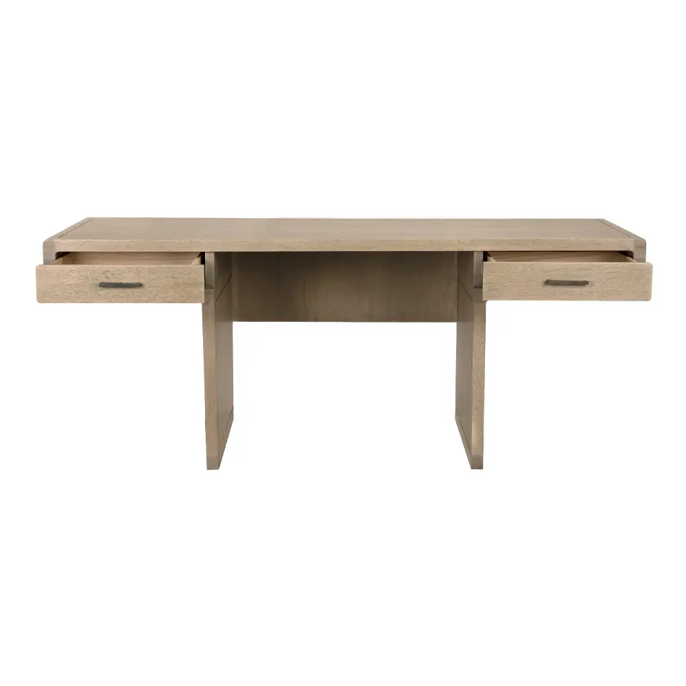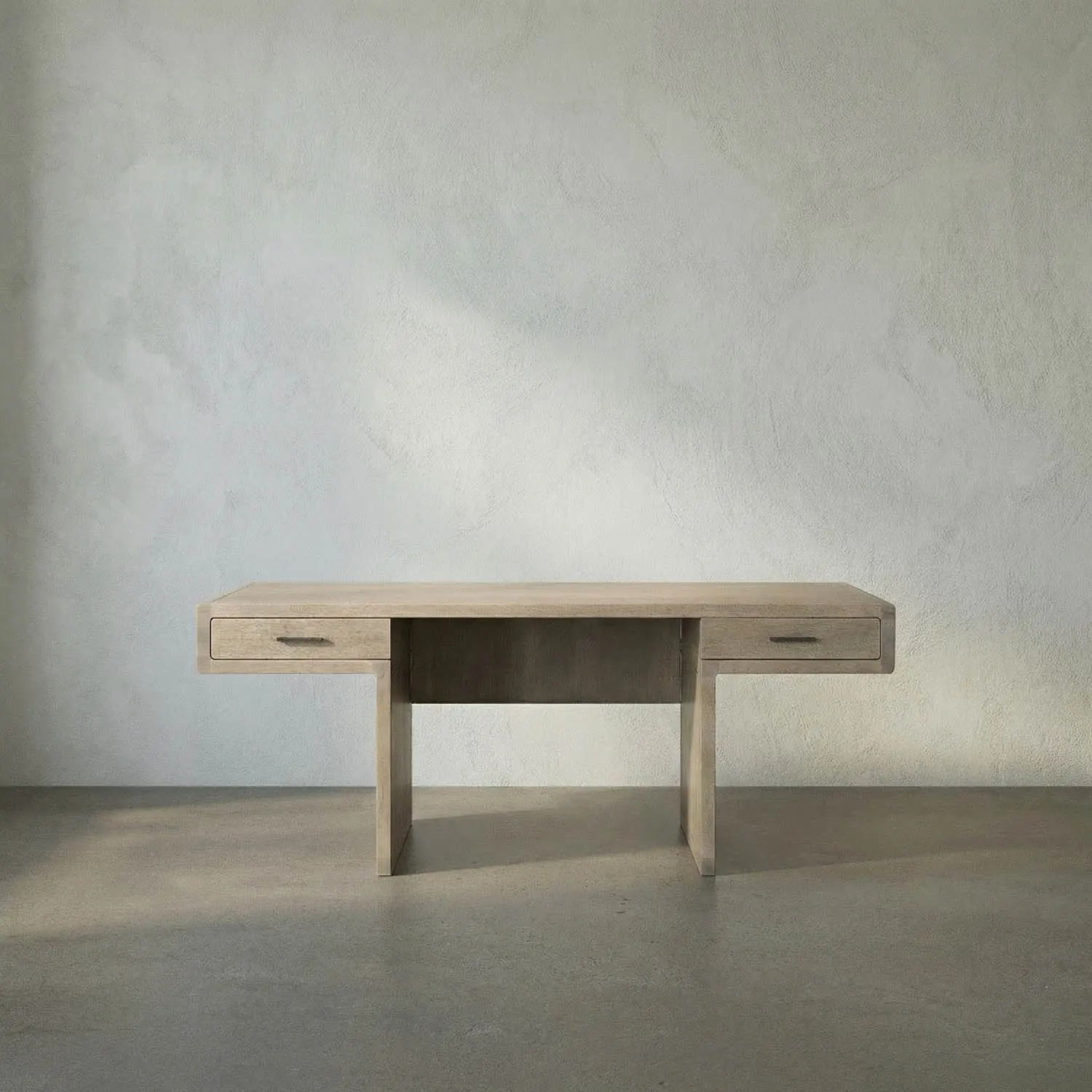 The Degas Desk showcases a washed walnut finish with natural grain, sleek lines, and a streamlined silhouette. Its two drawers provide discreet storage, blending warm wood tones with minimalist design for a sophisticated, modern workspace.