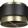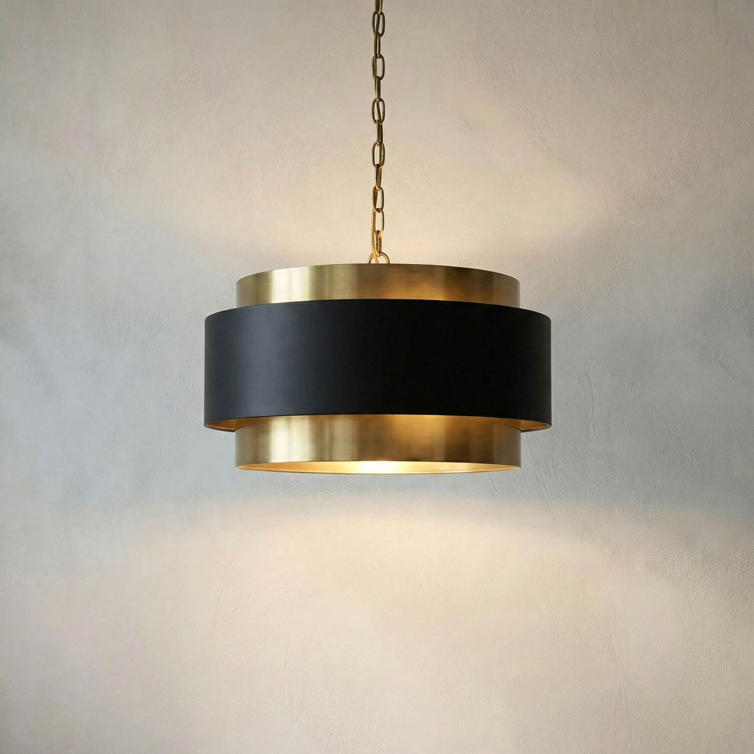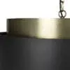 The Demetrius Pendant features a matte black iron exterior shade that wraps around an antique brass interior shade, creating a sculptural and high-contrast fixture. Its bold, industrial form delivers both graphic impact and a refined edge.