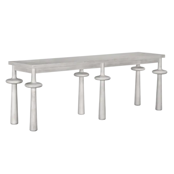 This sculptural sideboard features a long, clean-lined top supported by six exaggerated, spindle-like legs with rounded mid-collars. Its soft, chalky white-wash finish gives it a minimalist yet whimsical character, ideal for artistic or gallery-inspired spaces.