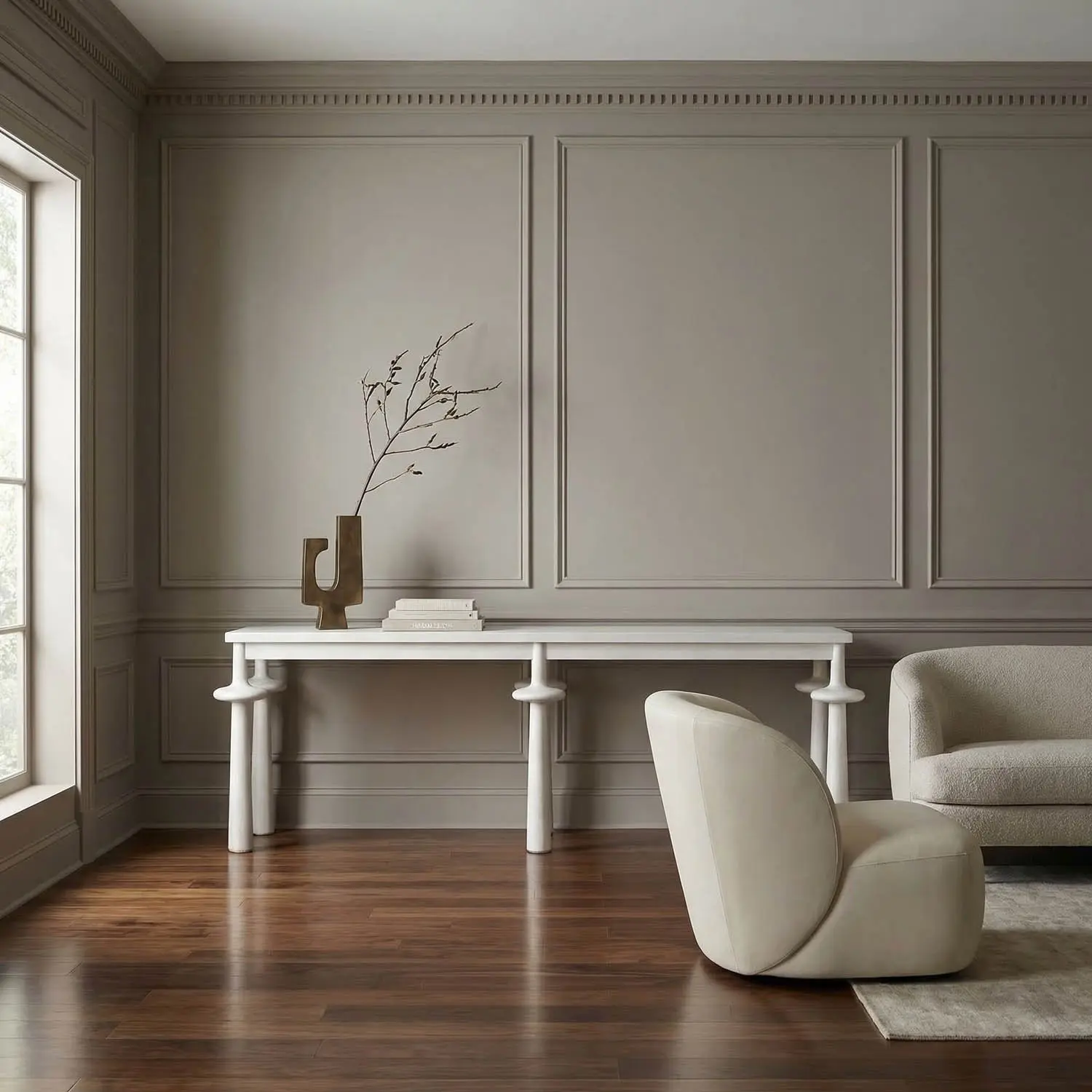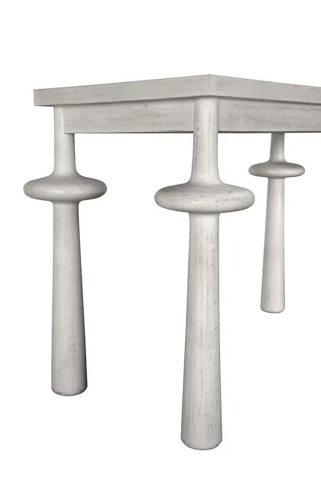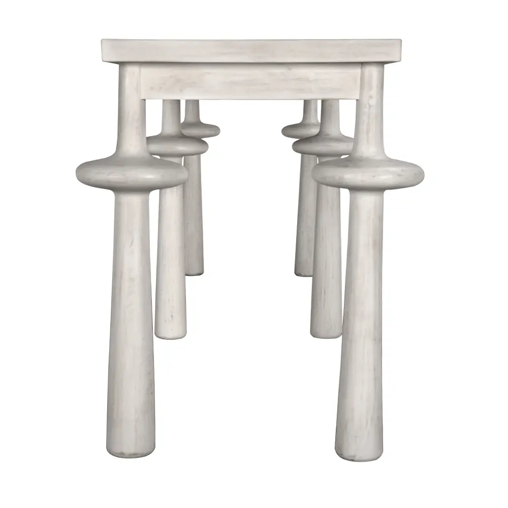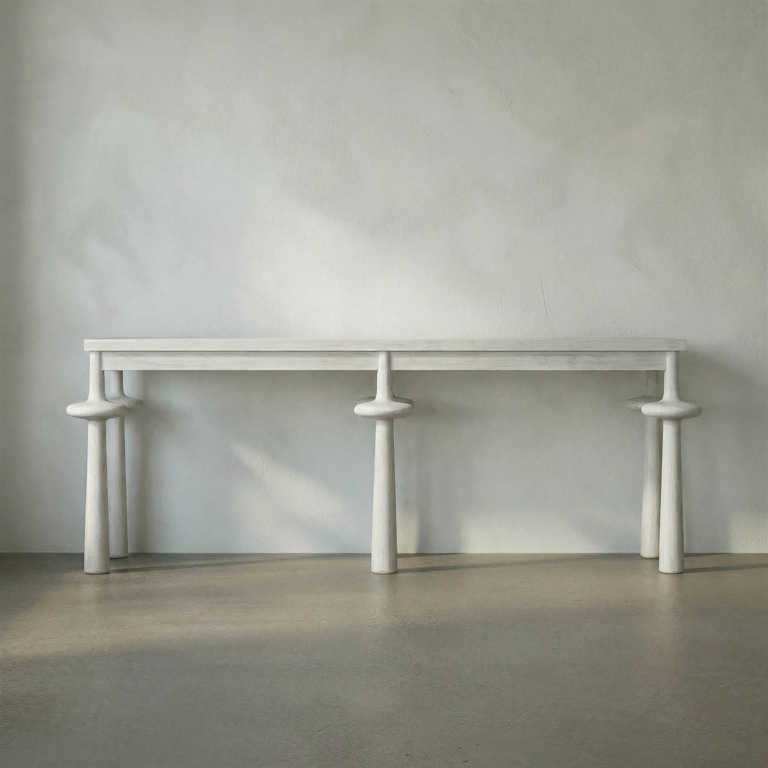 This sculptural sideboard features a long, clean-lined top supported by six exaggerated, spindle-like legs with rounded mid-collars. Its soft, chalky white-wash finish gives it a minimalist yet whimsical character, ideal for artistic or gallery-inspired spaces.