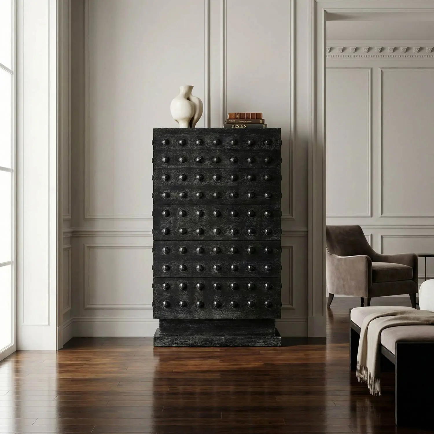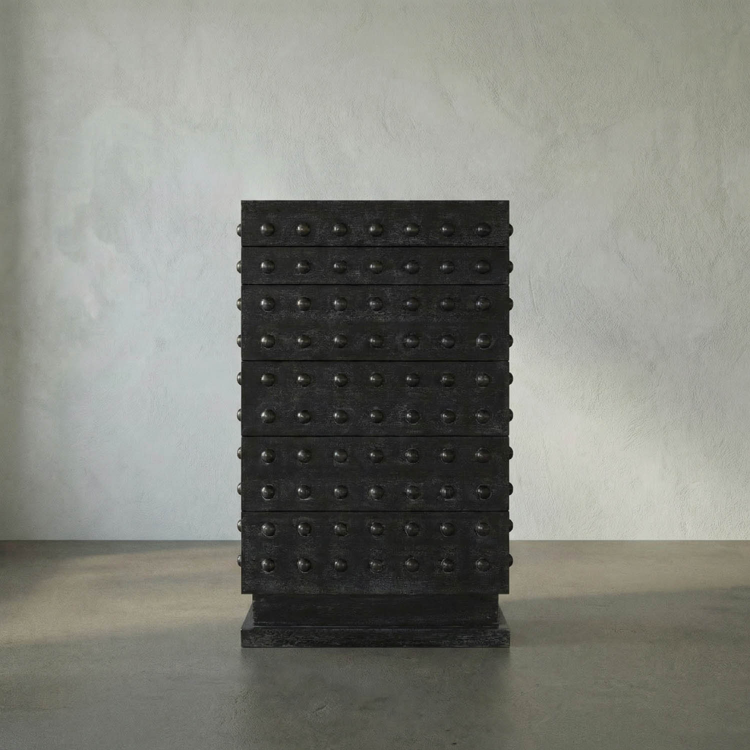 The five-drawer Didier Cabinet evokes ancient carved doors, lending timeless architectural character. Seamless drawer fronts and rich grain balance generous storage with refined craftsmanship and modern minimalist style.