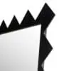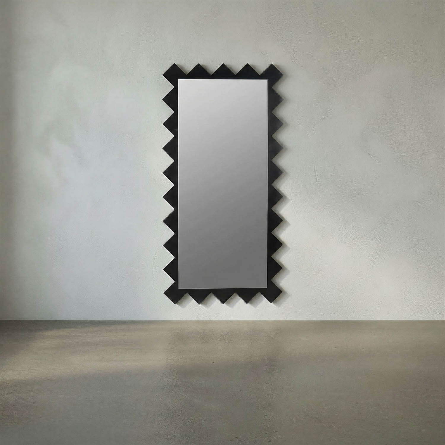 The Didier Mirror features a tall, rectangular matte black iron frame with jagged, zigzag edges. Its sculptural graphic design makes a bold statement, adding edgy character.