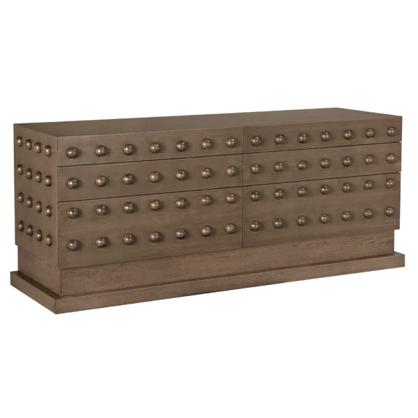 This six-drawer sideboard features a Greige walnut finish, clean lines, and sculptural domed drawer pulls. Its modern-organic design balances natural warmth with minimalist geometry, offering functional storage while serving as a refined, versatile statement piece in contemporary interiors.