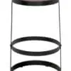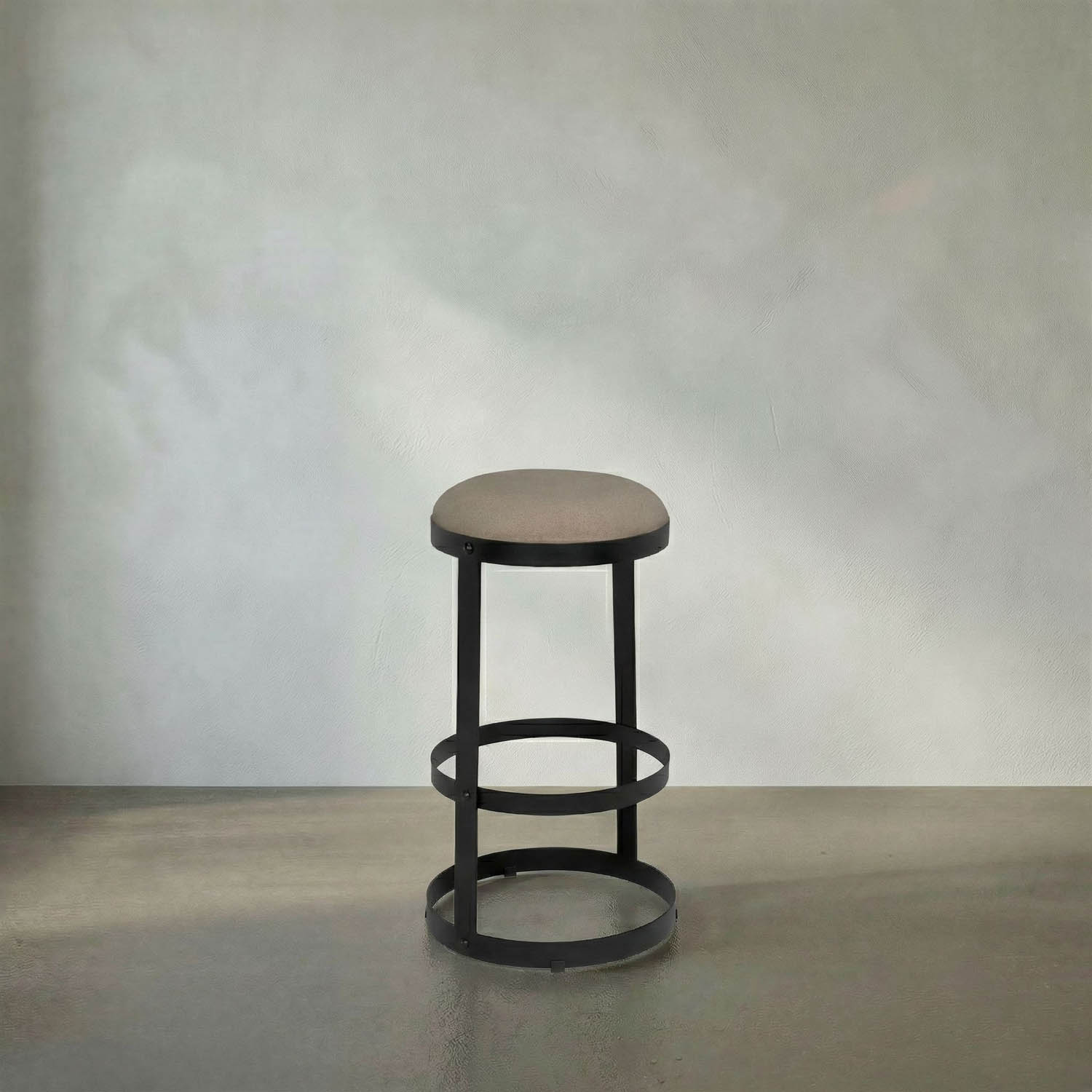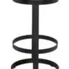 The Dior Bar Stool showcases circular iron bands stacked in a Matte Black finish, topped with a round seat upholstered in linen. Its sculptural, open-frame design harmonizes industrial edge with refined transitional style.