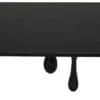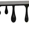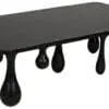 The Drop Coffee Table features sculptural mahogany legs resembling droplets, finished in a Hand-Rubbed Black, and is paired with a simple rectangular top for a striking modern look.