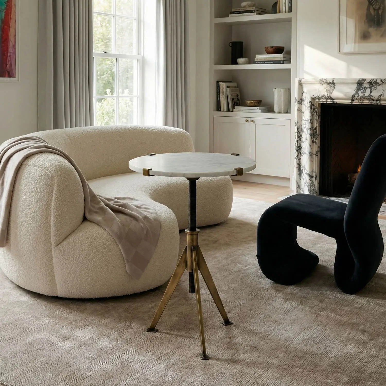 The Edith Small Adjustable Side Table features a Bianco Crown Marble top on a sleek Antique Brass finished quadropod base. Its height can adjust from 24.5_ to 33_, blending mid-century modern style with functional versatility.