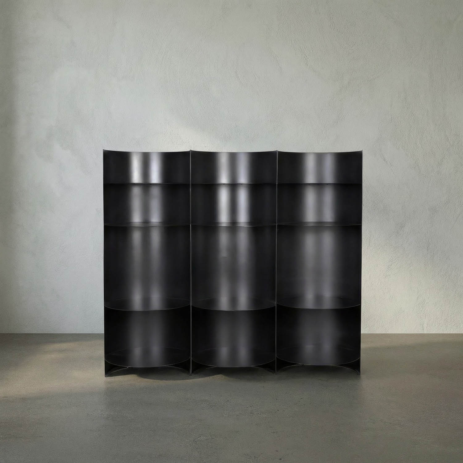 Artisans craft black iron into dramatic, half-round column bookshelves featuring round shelves. Units can be used individually or bolted together for added strength and stability. Matte Black finish.