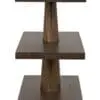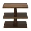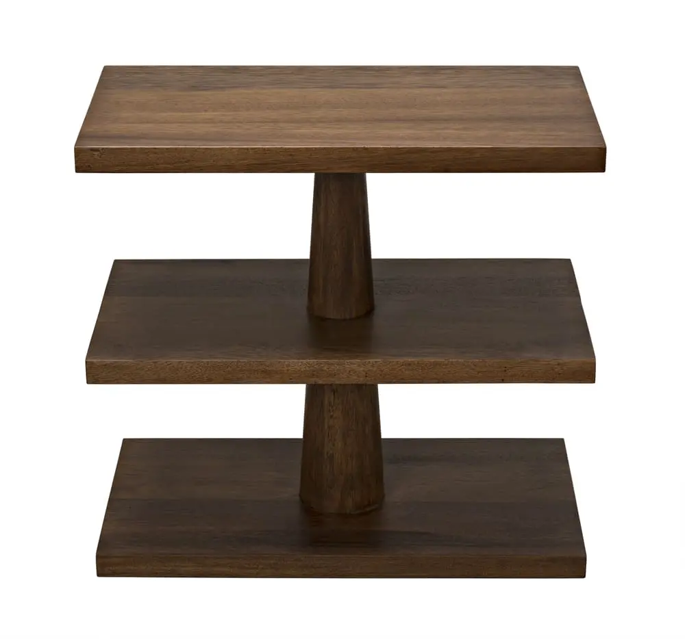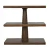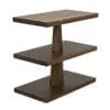 The Fatima Side Table in Dark Walnut features three stacked shelves and combines minimalist and organic design styles. Crafted from walnut, it introduces warmth, functionality, and sculptural appeal to various interior settings.