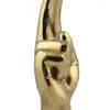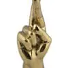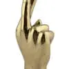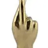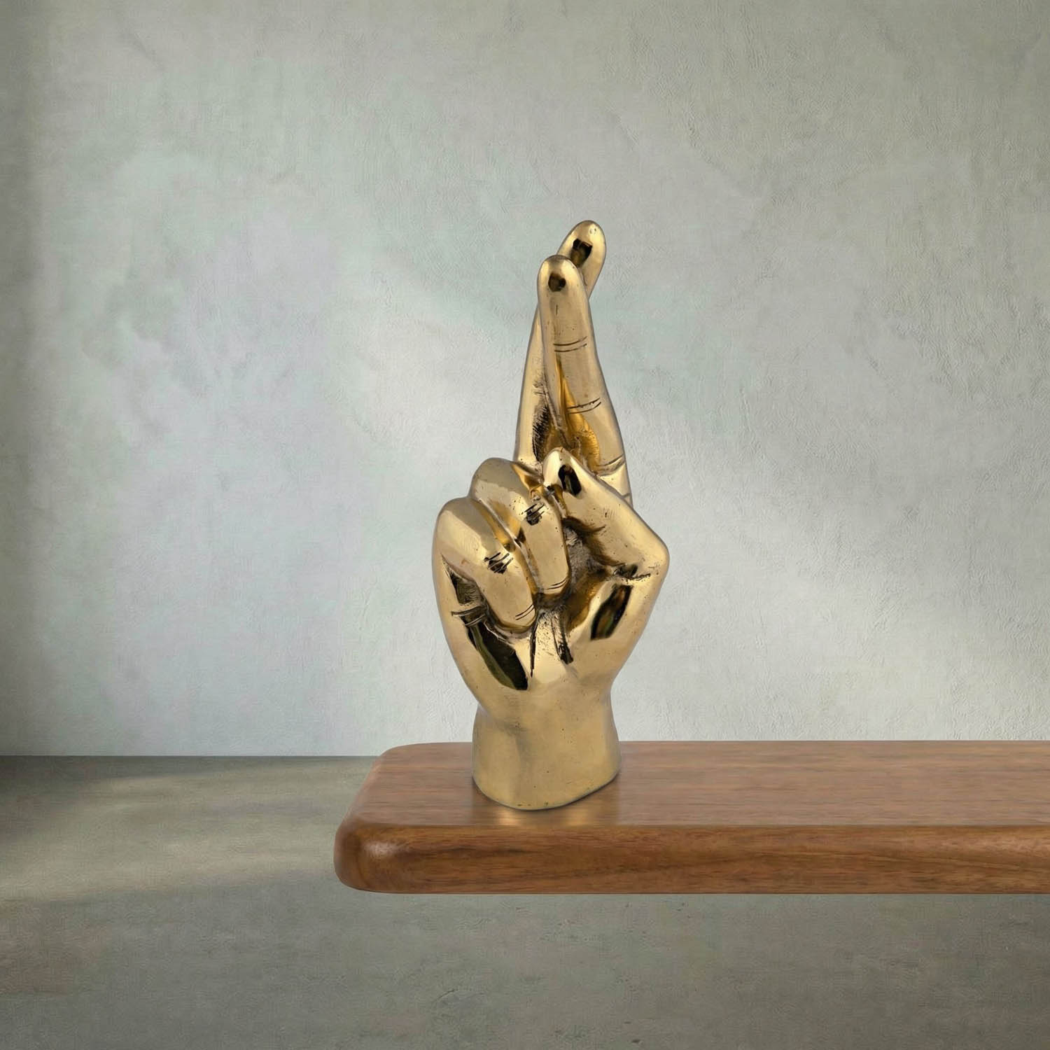 A polished brass sculpture of a hand with fingers crossed, symbolizing good luck.