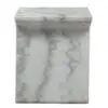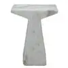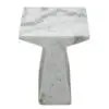 This side table is a sculptural accent piece made from solid white marble. Its minimalist design features a trapezoidal prism with a flared top, highlighting the unique natural veining.
