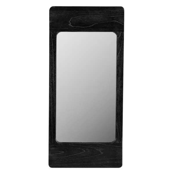 This modern mirror showcases a bold, narrow Charcoal Black frame with gently rounded inner and outer corners. Its sleek vertical silhouette and deep frame recess give it a sophisticated yet grounded appearance.