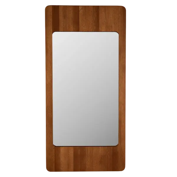 This wall mirror features a sleek rectangular design with rounded corners and a rich wood frame. Its minimalist aesthetic blends mid-century and modern styles, making it ideal for contemporary or Scandinavian-inspired interiors. Includes a French cleat.