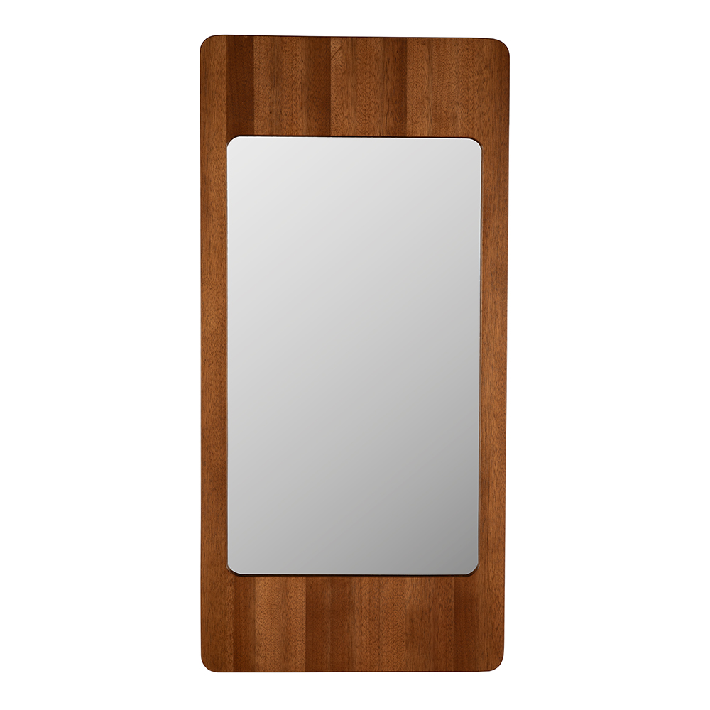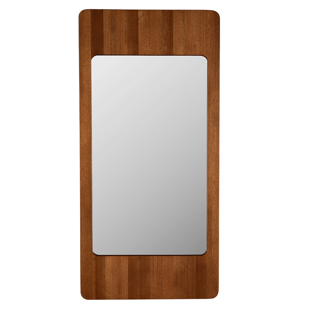 This wall mirror features a sleek rectangular design with rounded corners and a rich wood frame. Its minimalist aesthetic blends mid-century and modern styles, making it ideal for contemporary or Scandinavian-inspired interiors. Includes a French cleat.