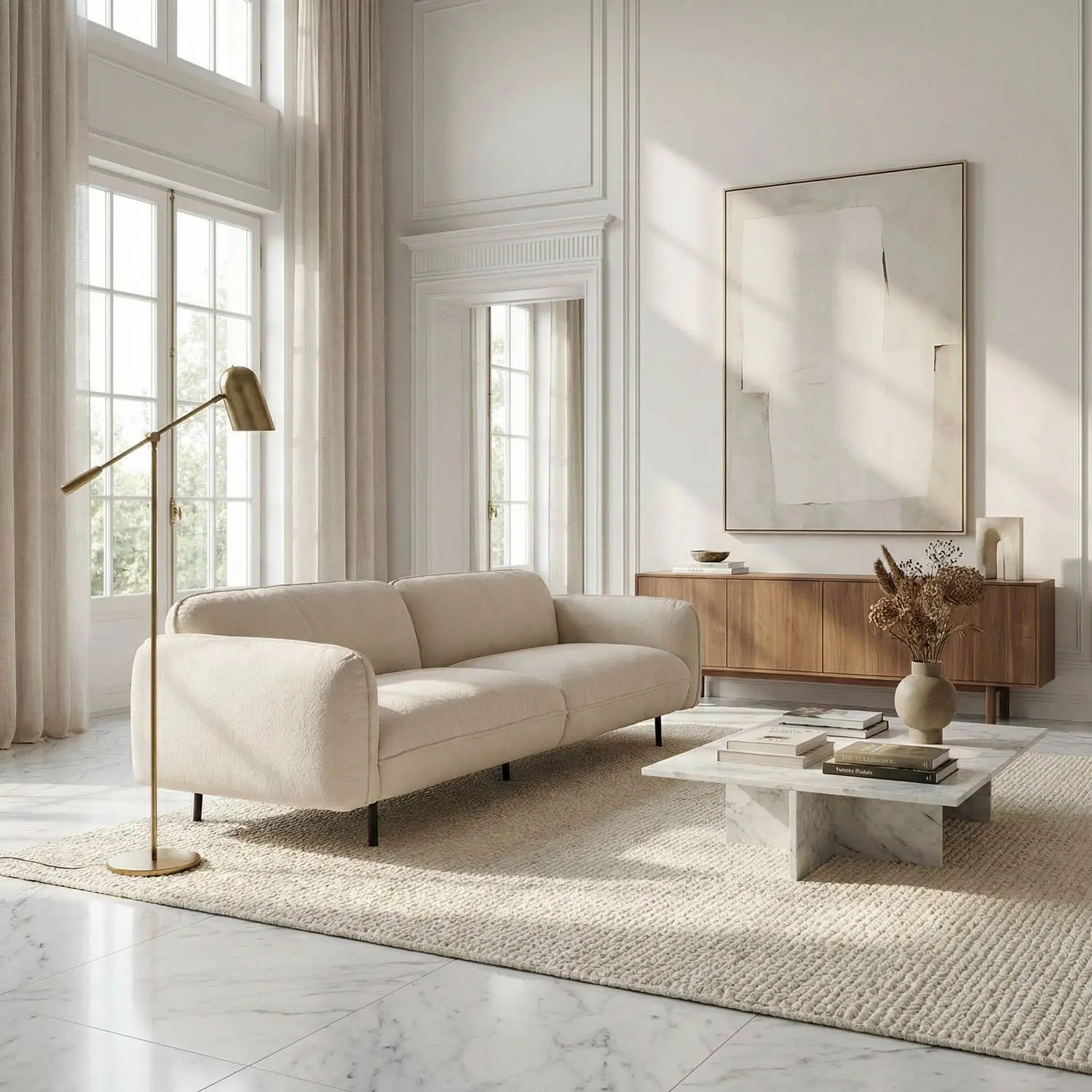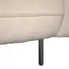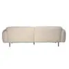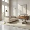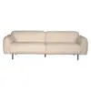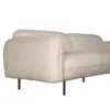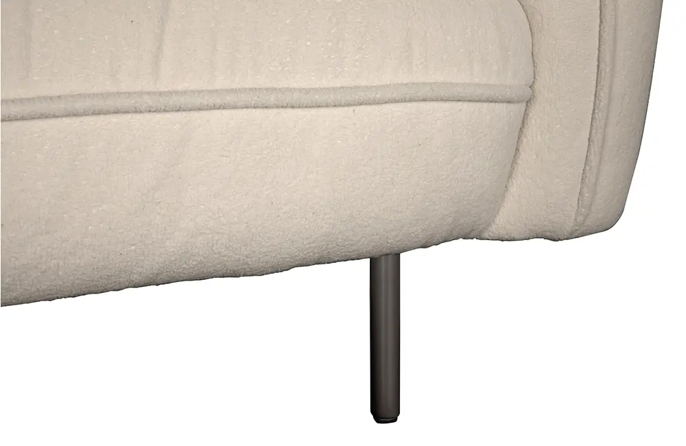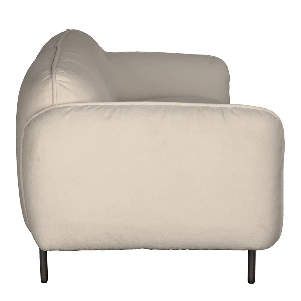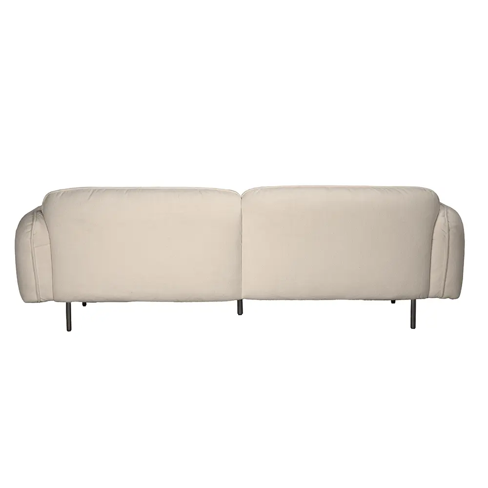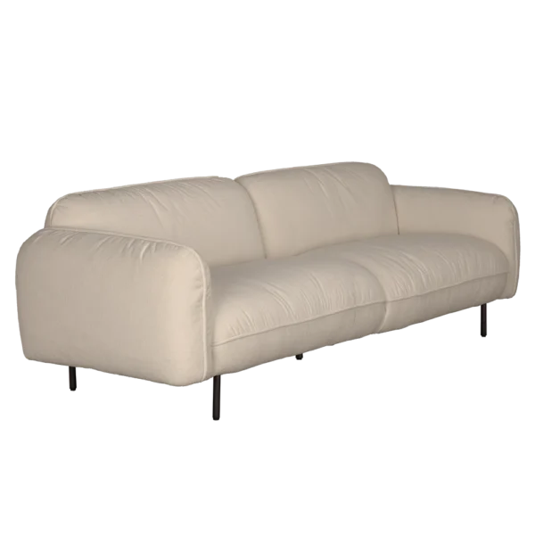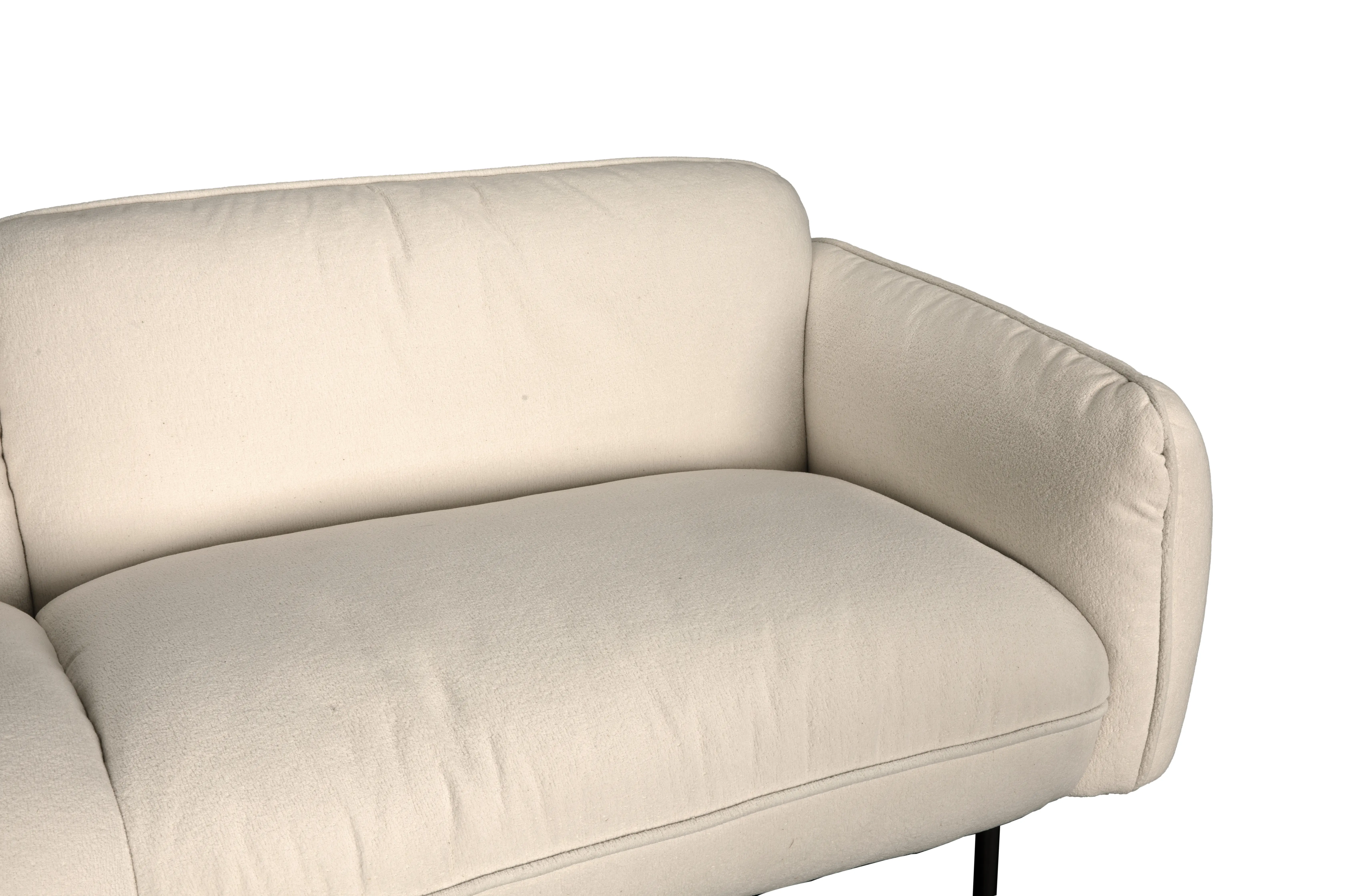 This sofa has a sleek, low-profile silhouette with gently rounded arms, upholstered in off-white performance chenille. Iron-grey powder-coated sled legs add a subtle industrial elegance, creating a modern and versatile centerpiece that balances comfort with refined minimalism.
