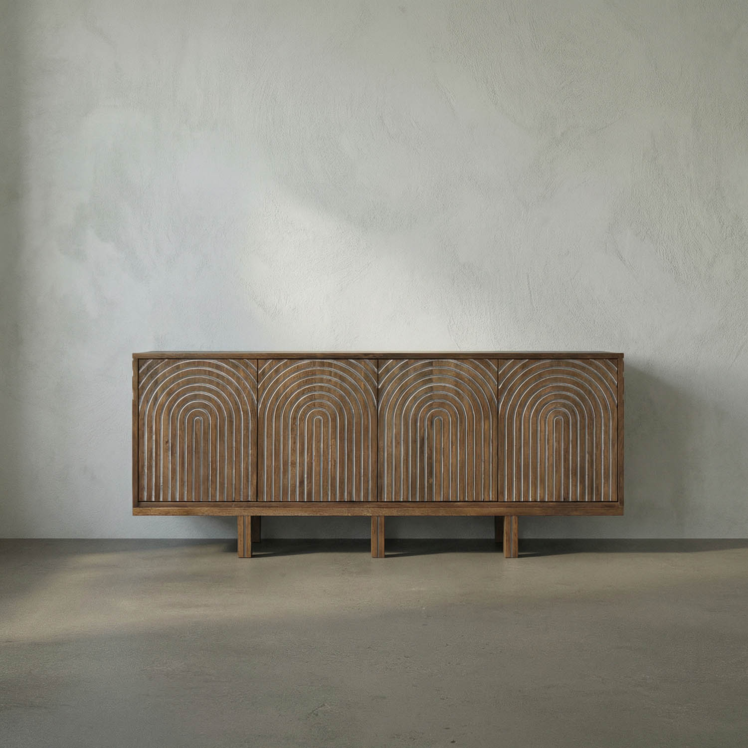 The four-door Ryder Sideboard combines mid-century modern and contemporary minimalist styles, featuring dark walnut veneer, grooved arches, and sleek cylindrical legs for a warm and timeless appearance.