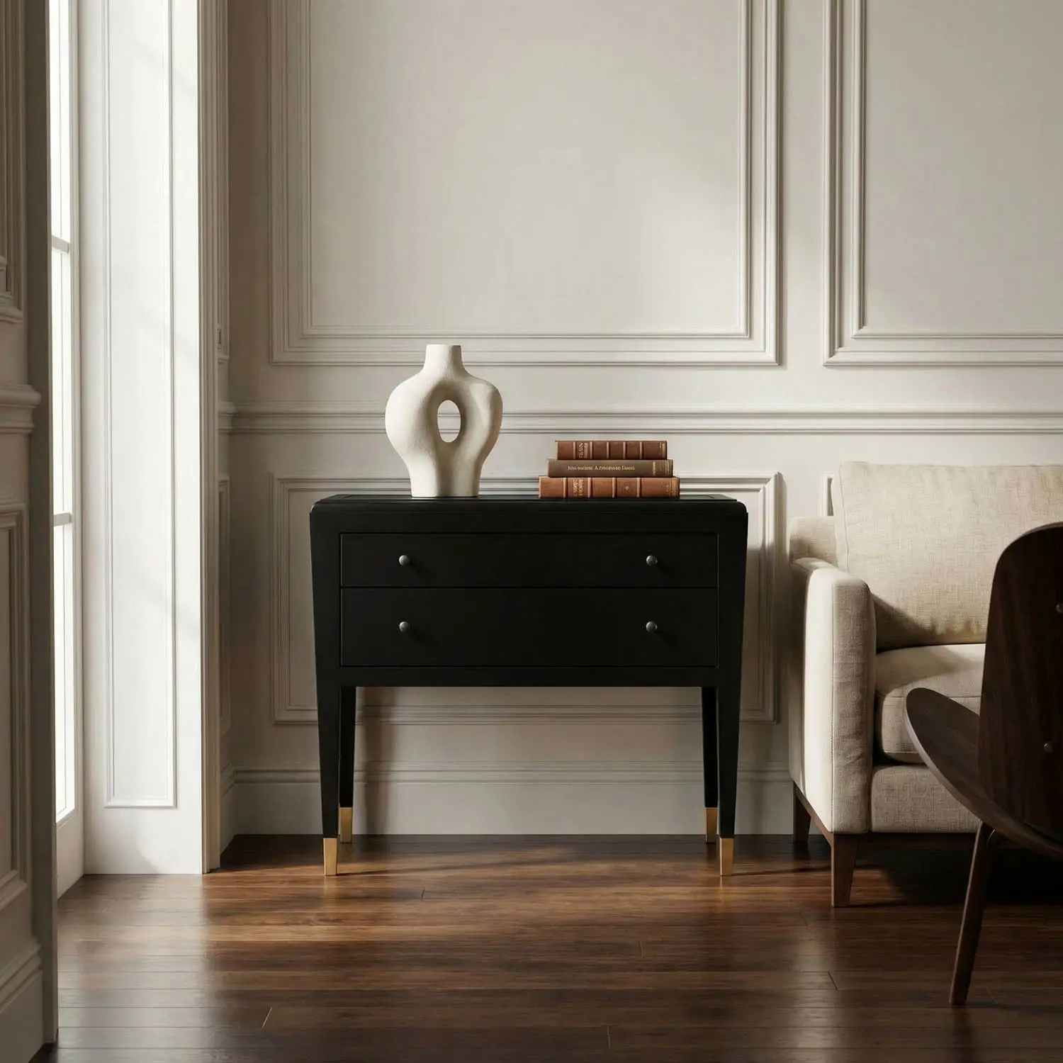 The Grant Sideboard blends modern minimalist design with subtle Hollywood Regency. Its sleek Black finish, clean lines, and understated hardware offer versatile storage with a refined presence that anchors glamorous and contemporary spaces alike.