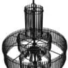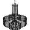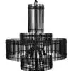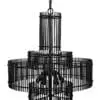 The Ghost Chandelier features a matte black iron frame with five circular tiers of thin vertical rods. Its open, layered design creates visual depth and a modern industrial feel, making it a bold centerpiece that diffuses light softly across a room.
