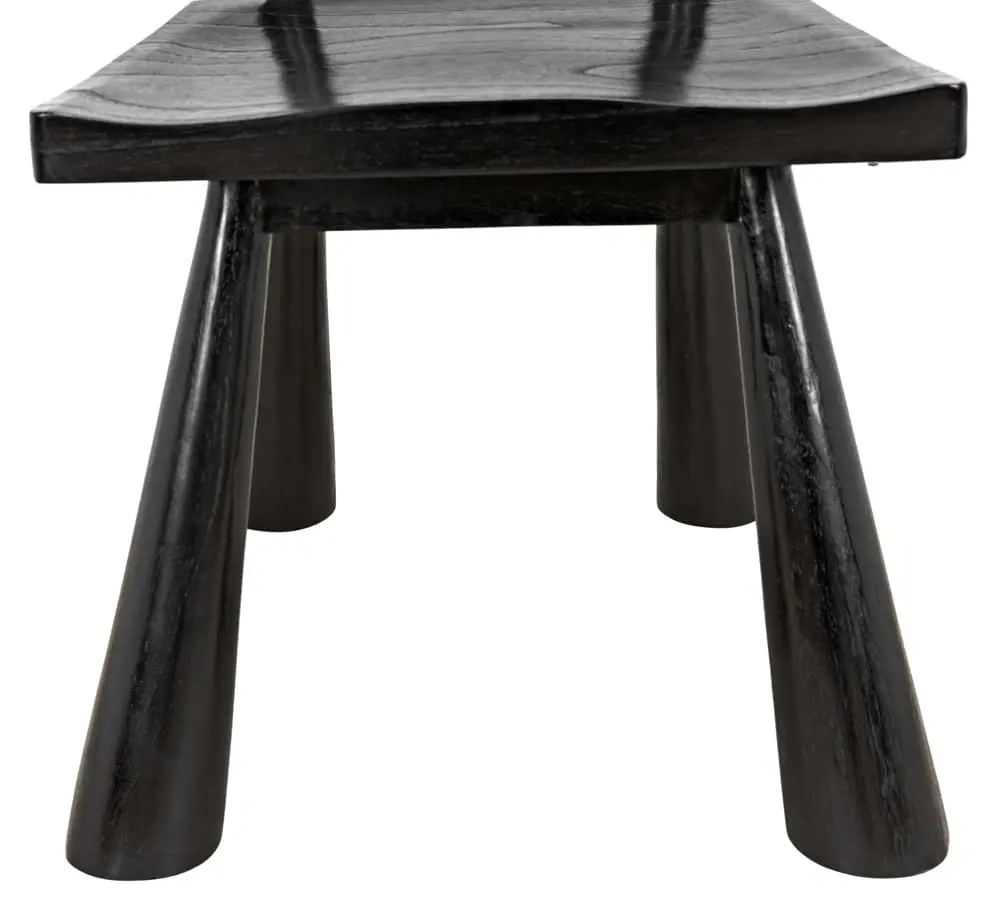 Our Gilbert dining chair features a chunky and expressive frame with conical legs, stiles, and a contoured back and carved seat. The satin sheen Charcoal Black finish subtly highlights the unique grain of each piece for a subtle ceruse effect.