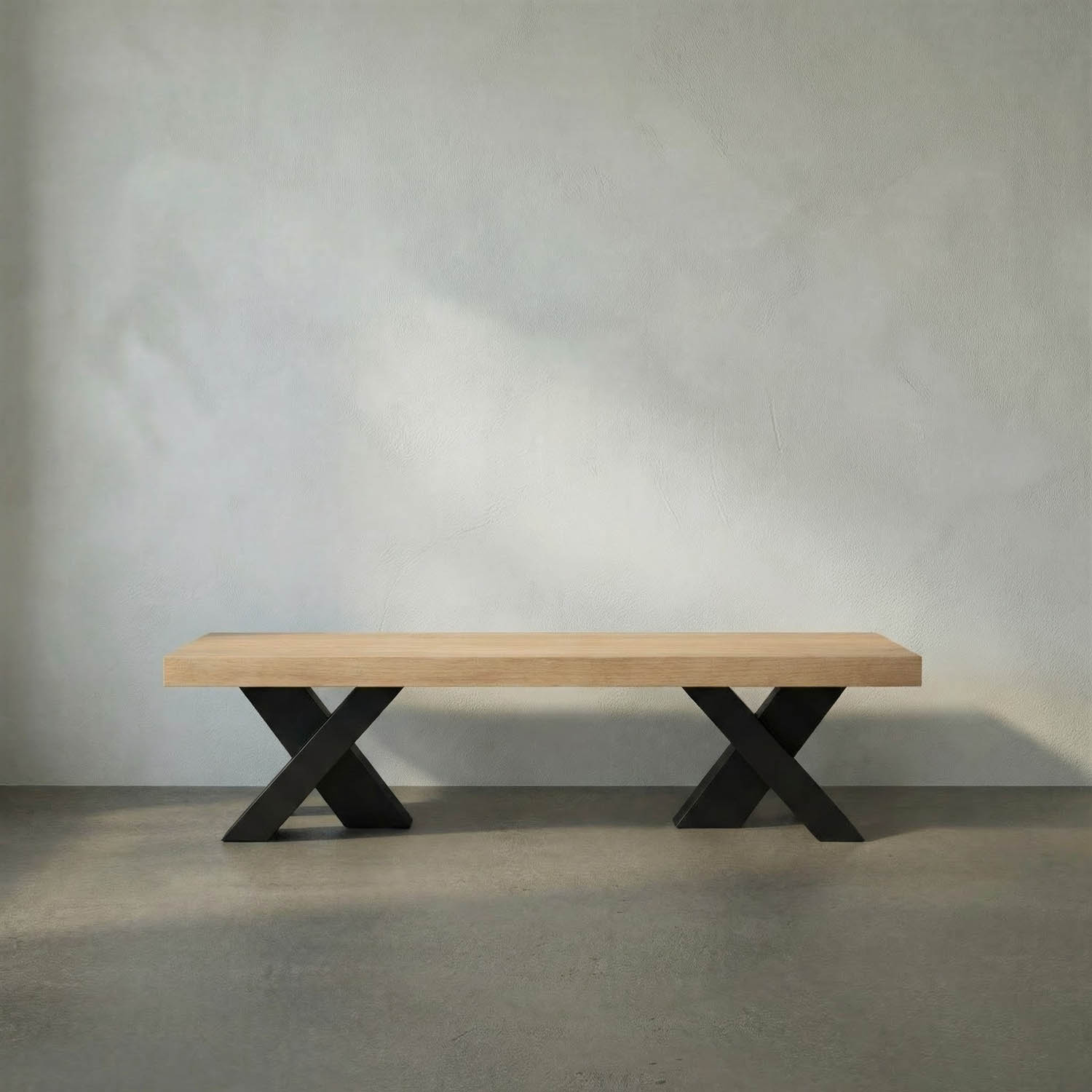 The Gravity Bench beautifully combines industrial strength and natural warmth, featuring a thick white oak top supported by bold, black X-shaped metal legs, creating a striking minimalist piece with geometric contrast.