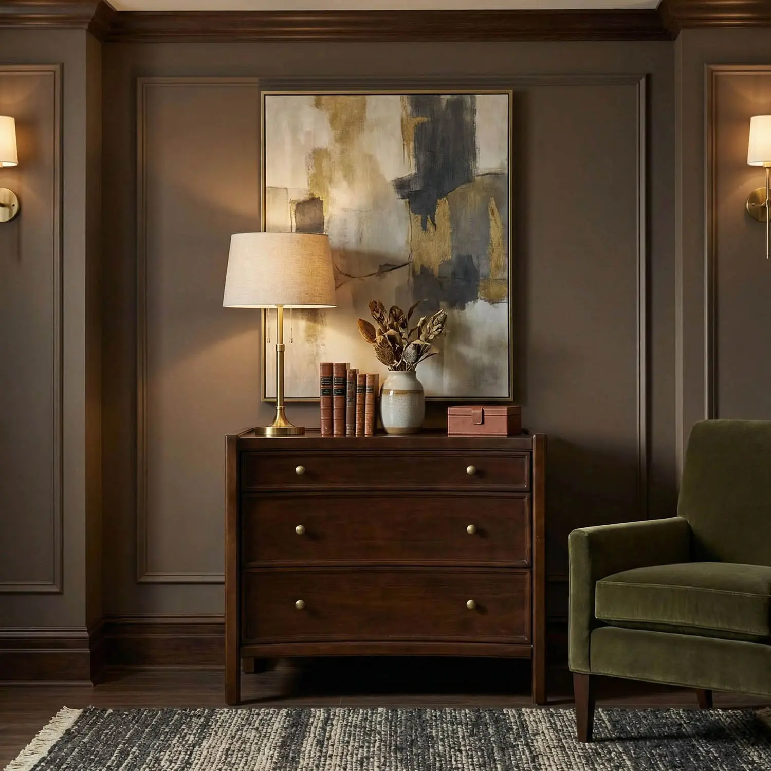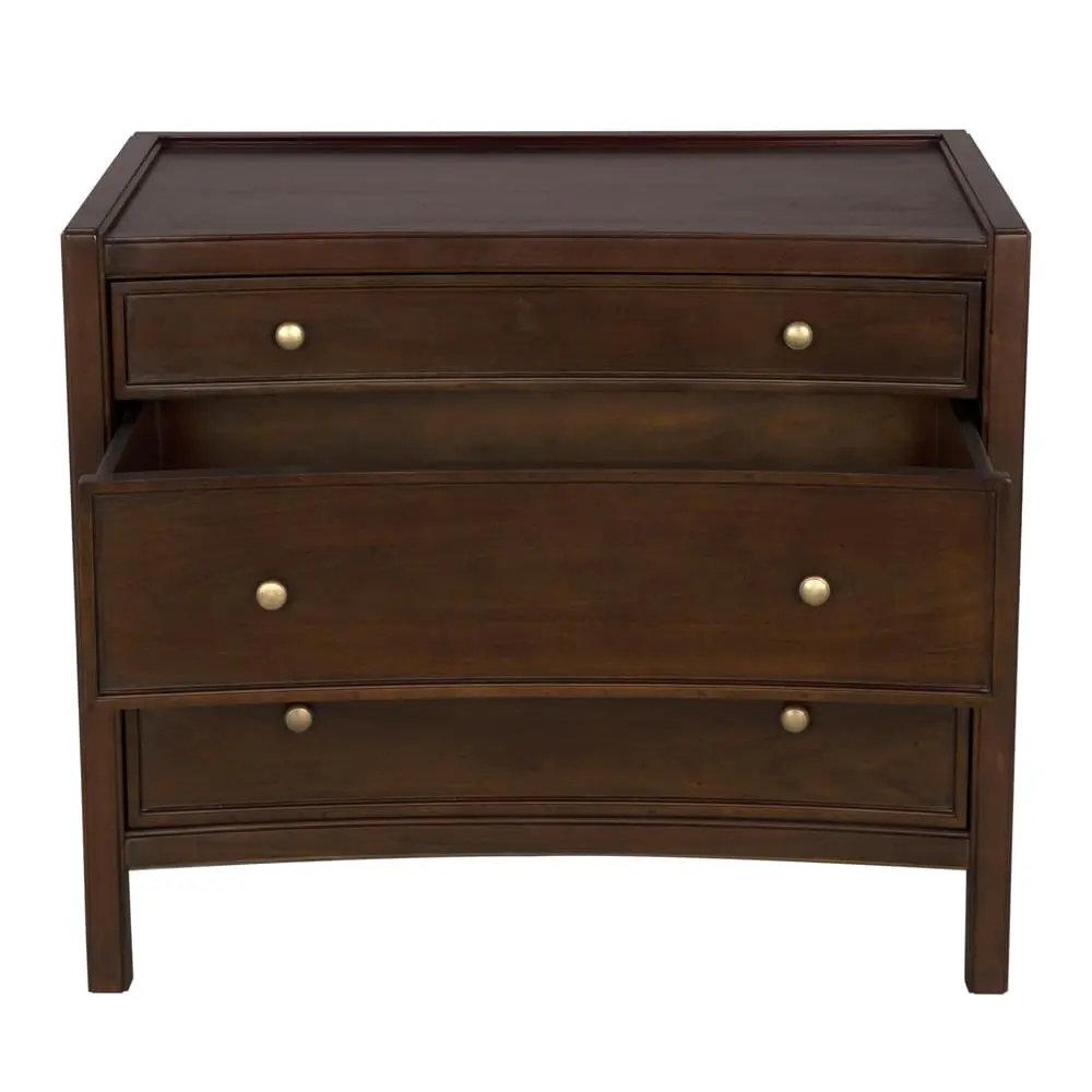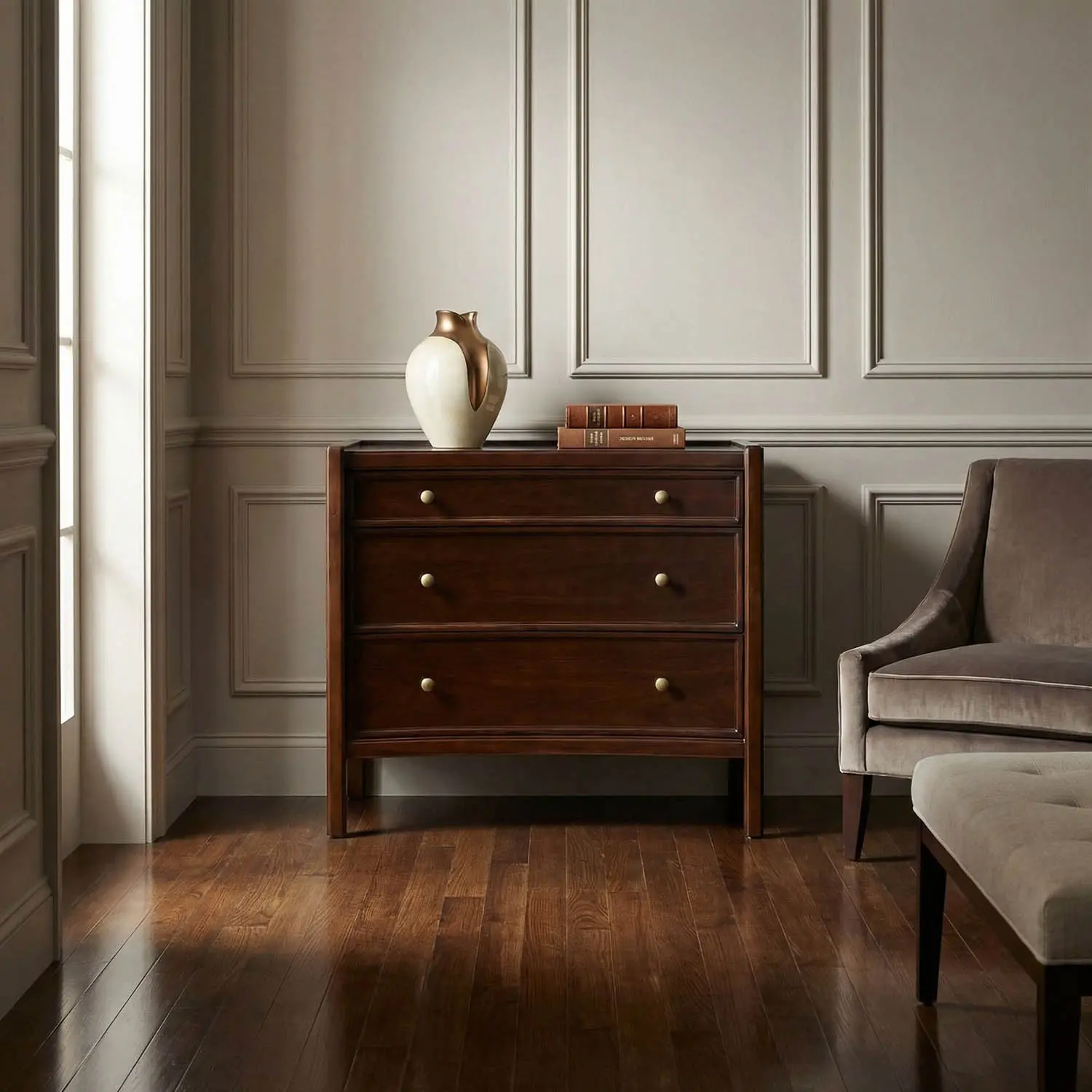The Hampton Side Table pairs classic proportions with a modern edge. A Hand-Rubbed Brown finish softens the mahogany grain, while three clean-lined drawers with solid brass pulls deliver grounded, functional design.