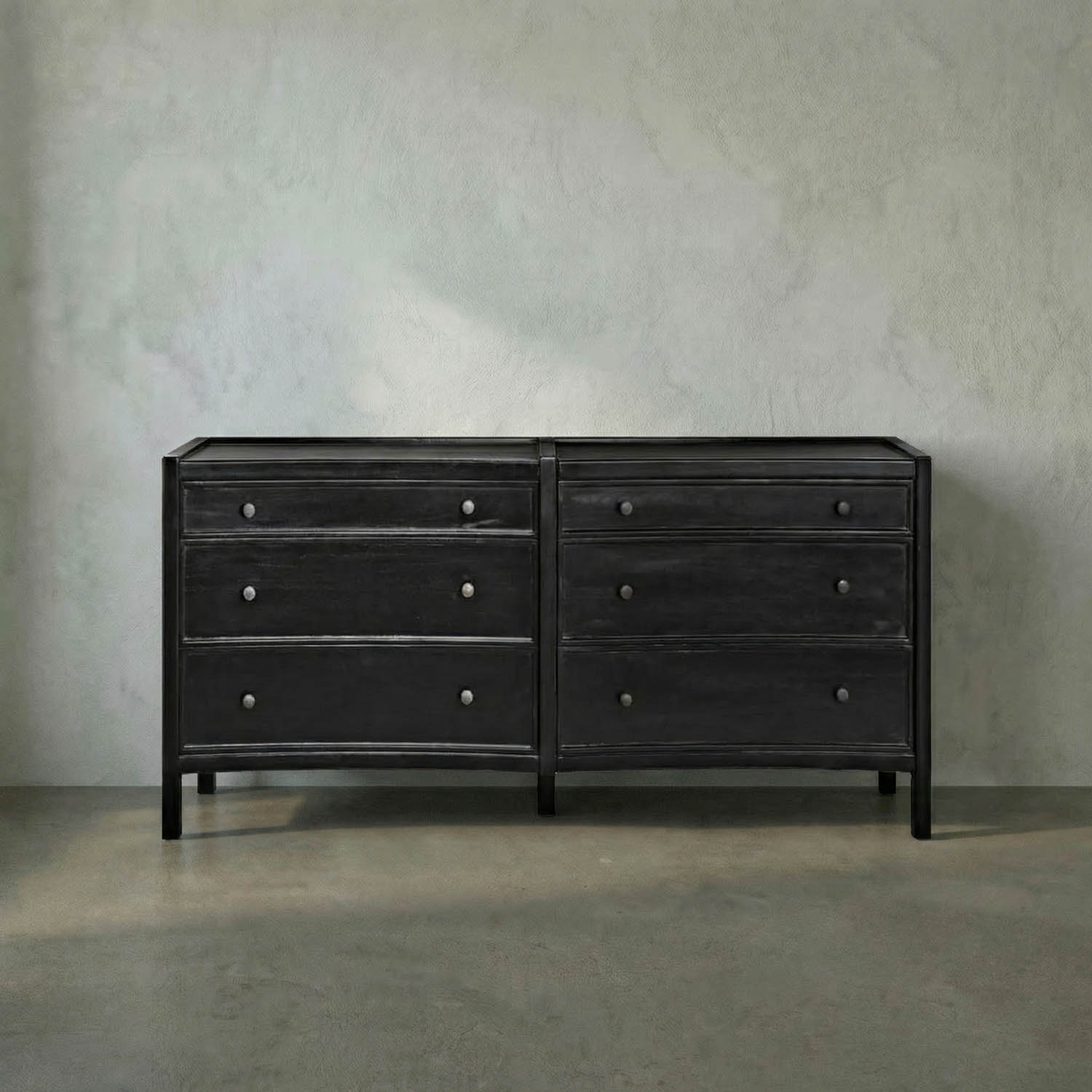 The Hampton Tall Boy pairs classic proportions with a modern edge. A Hand-Rubbed Black finish deepens the mahogany grain, while six clean-lined drawers with solid brass pulls deliver grounded, functional design.