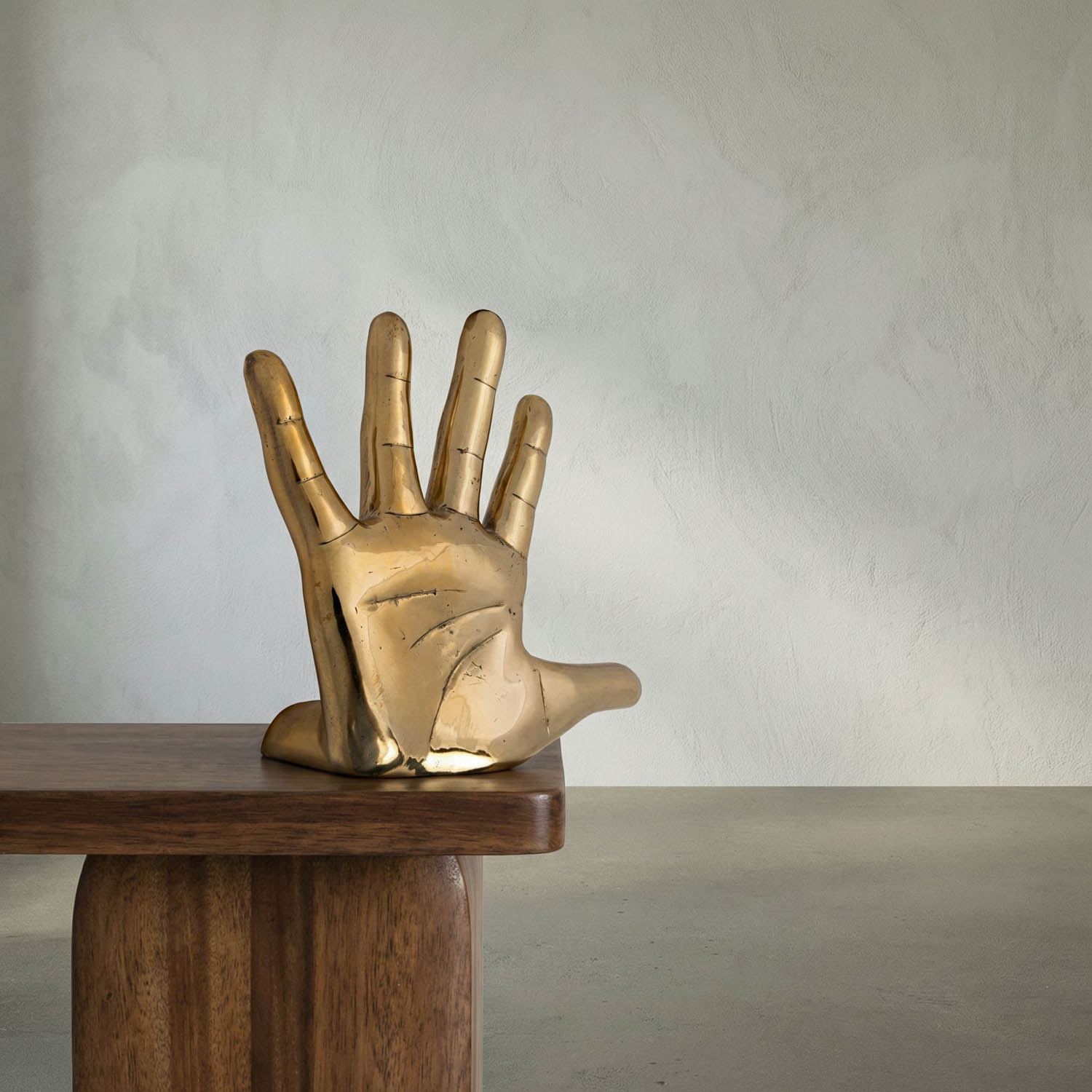A wall-mountable brass sculpture in the shape of an open human hand. Sculptural yet functional, it can serve as both a decorative art object and a symbolic gesture of welcome or openness.