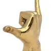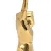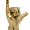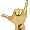 A brass sculpture of a hand conveying a friendly “hang loose” or “hello” sentiment.
