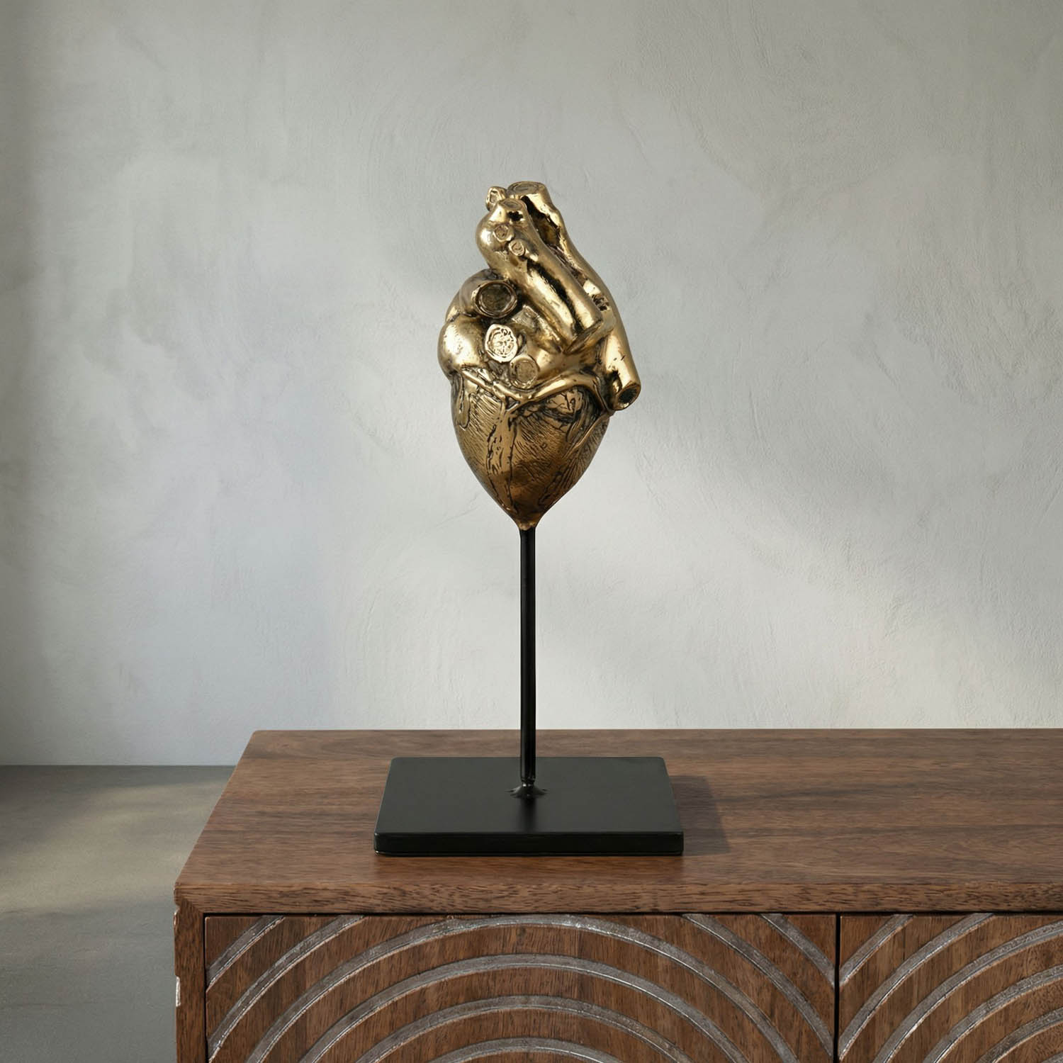 A brass heart sculpture mounted on a slender black rod attached to a rectangular black base. Intricately detailed and artistically expressive, it’s a contemporary and slightly edgy sculpture.