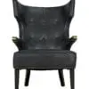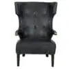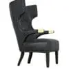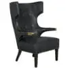 The Heracles Chair blends classic wingback style with modern details. It’s upholstered in black leather and brass nailhead accents, resting on dark walnut legs.