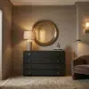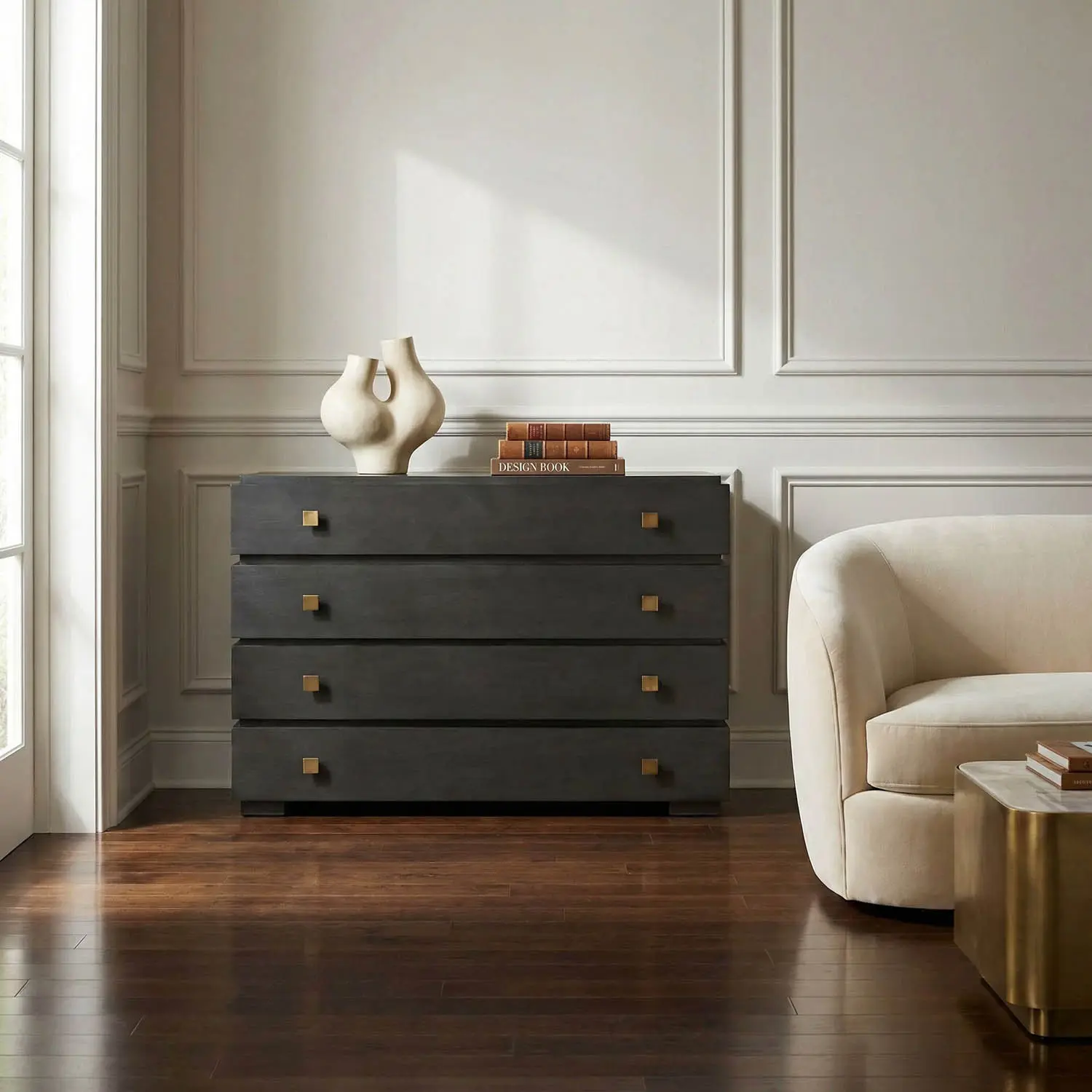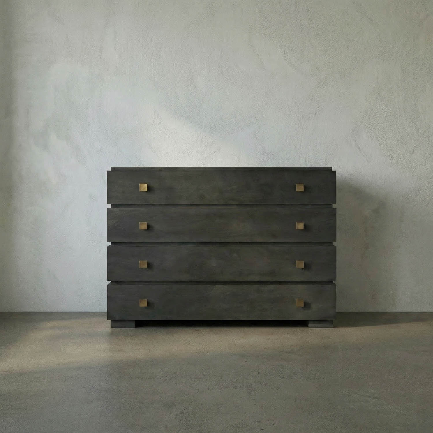 The Hofman Dresser features a sleek modern design in our Pale finish, accented by square brass pulls. With four spacious drawers, it provides stylish and functional storage, adding refinement and a bold presence to any space.